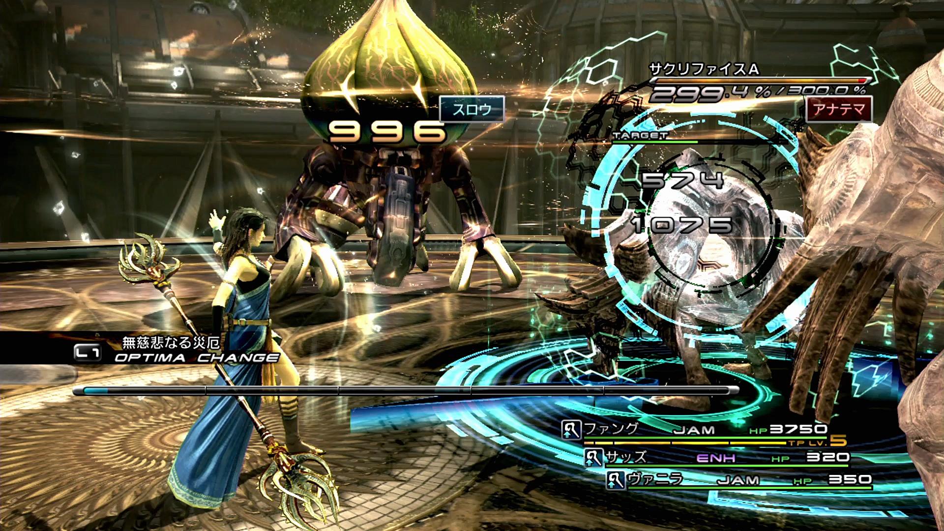 …もっとも、それらのAIの穴を埋める手として、FF13には「手動コマンドの入力」という方法が用意されている。しかしながら、それができるのはリーダーだけであり、メンバー編成の都合でJAMをリーダーに出来ない場合もある。しかも、コマンド入力は大幅なタイムロスになる。よって本プレイでは、手動コマンドの入力を使えない場合も多かった。