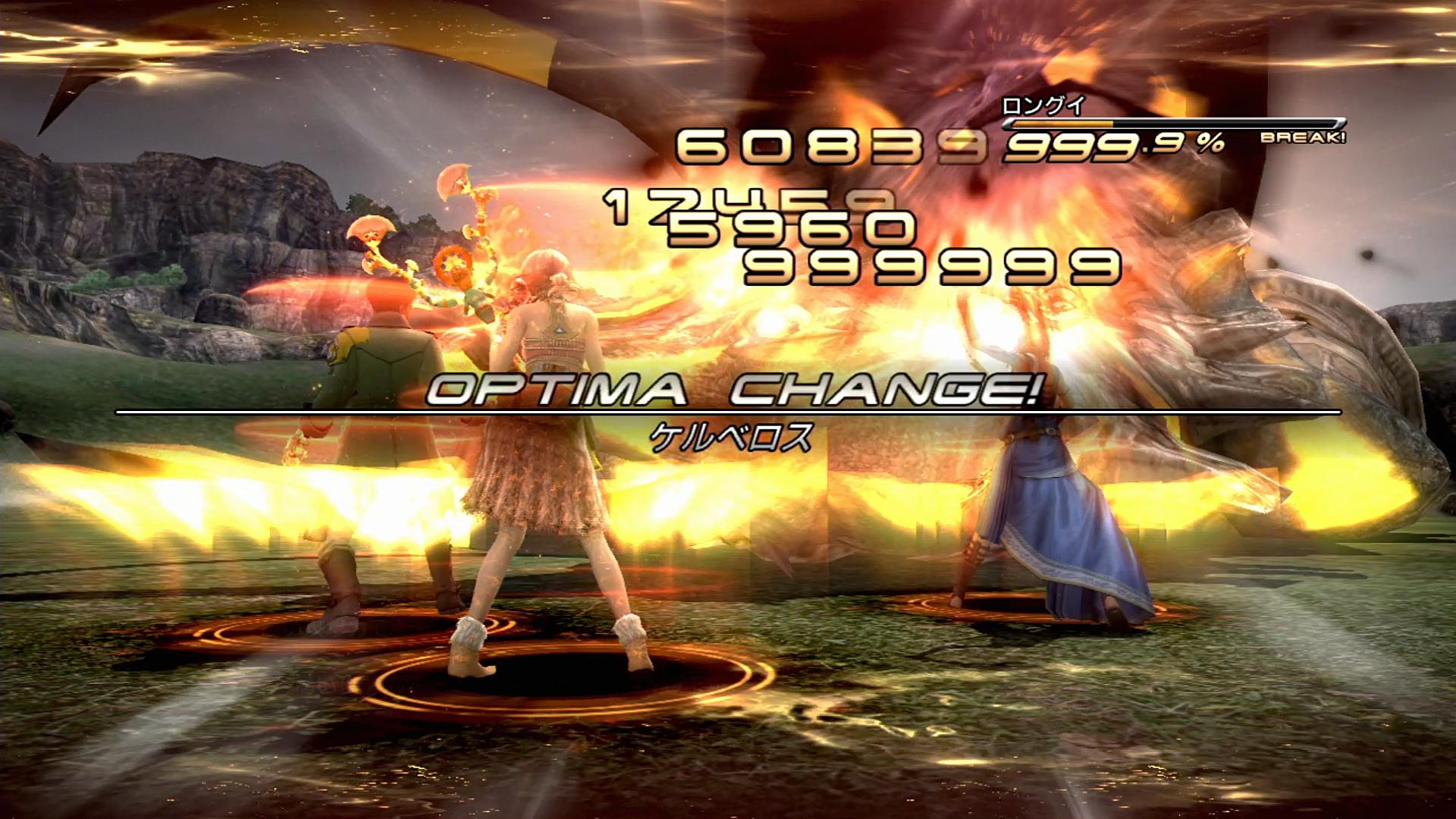 ――ちなみに、これまで何度も活躍したホープBLAの「ラストリゾート」は、今回は「ウィーク」で相手の耐性を消せるため、あまり強みを感じなかった。ファングATKの「ハイウィンド」も、火力を出すためにはファングを物理特化にする必要があるが、「たたかう」のモーションが遅すぎて他キャラと行動が合わず、全く駄目であった。その他、ライトニングをリーダーに起用し、チェーンボーナスを999.9%まで上げて、約162万を削れる斬鉄剣で切り捨てる…という変な手も考えたが、残念ながら魔法特化より好タイムを記録することは無かった。
