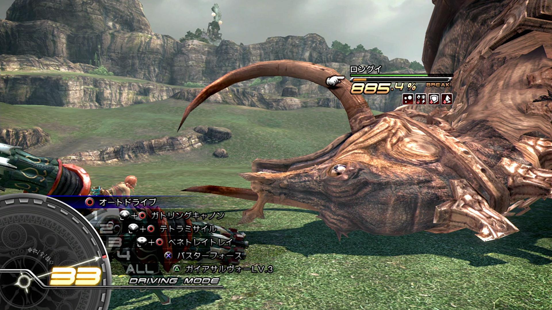 …さて、ロングイは、ご存じの通り、大平原で“輪っかになった7つのミッション”のクリア後にのみ登場する亀の進化系であり、FF13最強モンスターの呼び声が高い。通常攻撃で万を超えるダメージを与えてくるうえ、両足を倒さないと本体にまともな攻撃ができず、そして転倒させても「物理&魔法:耐久」が解除されないという圧倒的な耐久力を持つ。普通のプレイ方針では、CP稼ぎどころか、成長をあらかた終えた後にやっと戦えるくらいの相手である。