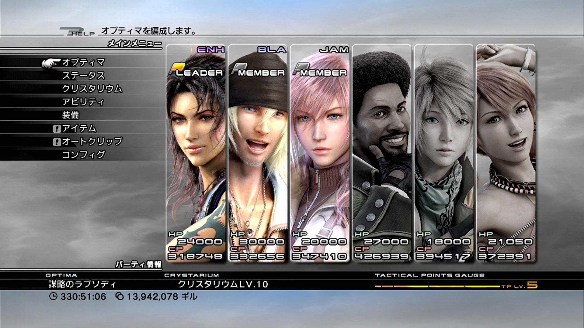…これについて、サブロールを全て成長させると、ファングENHが「ブレイダ」を真っ先に使ってくれなくなったり、各キャラクターのJAMで不要な技が発動してしまったり、ファングBLAが物理攻撃を使ってしまったりなどと、様々な問題が発生する恐れがある。しかし、無駄な行動は、それが発動してみないと無駄だとは分からないため、とりあえずは全成長をさせ、そこから必要に応じて育て直しを行う方針としたのだ。だからこその、「クリスタリウム封印&2000万ギル所持」という状態のデーター作成である。