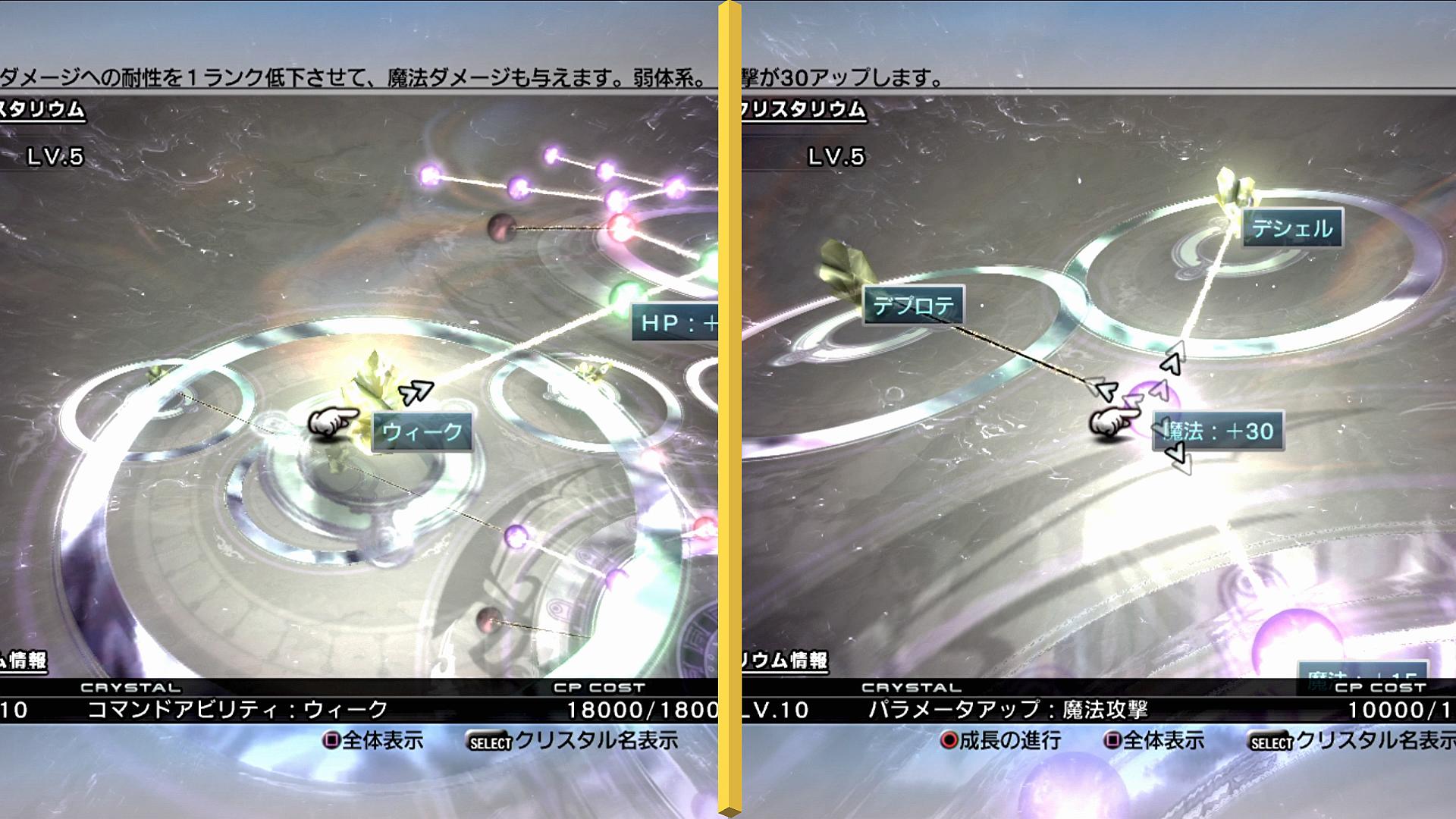 では、その他のキャラと比べてみよう。まず、サブロール系のキャラ(ライトニング・サッズ)は、デプロテ→デシェル→ウィークの順に覚えるため、ウィークは欲しいがデプロテが要らないという場合が非常に多かった。そして、メインロールのヴァニラも、デシェル(取得済み)→デプロテ→バイオ→ウィークの順に成長クリスタルが存在し、全てメインルートのため、どれかを諦めようとすると、以降の成長を全て捨てなければならなかった。