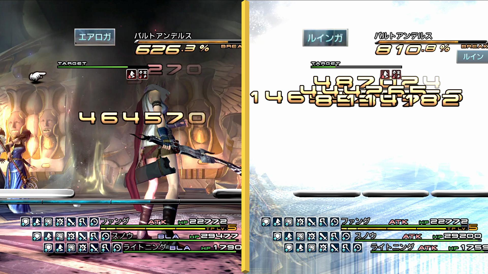 ――そしてもちろん、エアロガを使う理由として、ATKで適用した場合に大ダメージを与えられるという点も見逃せない。このバトルの状況だと、だいたい45万のHPを削ることができる。ちなみに、エアロガは、コマンド入力からダメージ発生までの時間がとても長いため、特にATKでダメージを適用しやすい魔法と言える。FF13のアビリティは、本当に色々な使い方ができるなあ…。