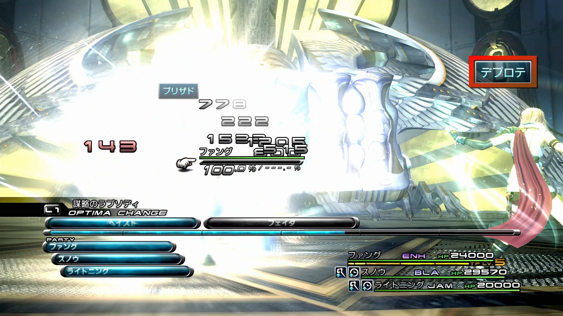 そんなわけで。ファングJAMの使用時と異なり、ライトニングによる初手のデシェル&ウィーク成功は、確率的にかなり苦しい。そこに、「ENHでヘイスト+フェイダを入力し、フェイダの文字が表示される瞬間にオプティマチェンジをすることで、演出の一部をカットする」という例のアレを成功させなければならないので、もう初ターンを乗り越えられるのが100回に1回程度という厳しい戦いとなってしまった。