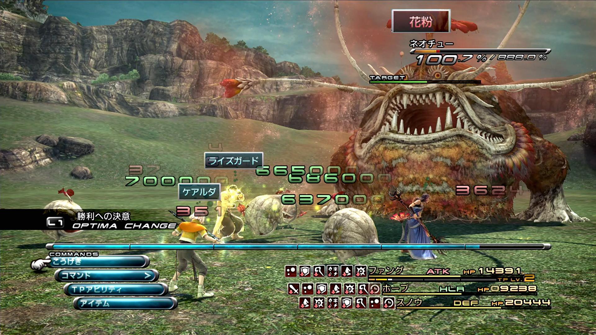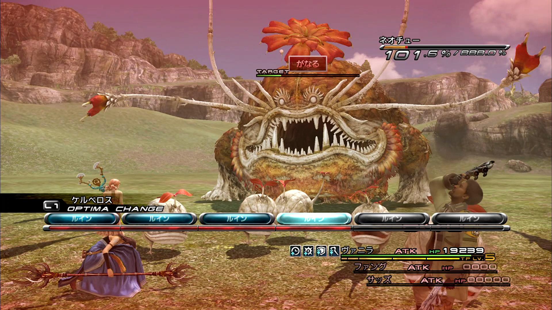 …まず、ネオチューの技で最も厄介なのは、大ダメージの「がなる」…ではなく、その後の「花粉」である。微弱なダメージと共に、「デプロテ」「カーズ」「スロウ」「デブレイ」「デフェイ」などを含む、合計8つのステータスを60〜70%という高めの確率で発生させる。しかも、スロウ状態のみ、約20秒で解除されるという慈悲を感じるが、その他のステータスは556秒も持続するため、自然解除には期待できない。FF13のAIは、ご存じの通り、「エスナ」を積極的には使ってくれないため、何発も喰らっていると、あっという間に異常地獄に陥ってしまうのだ。