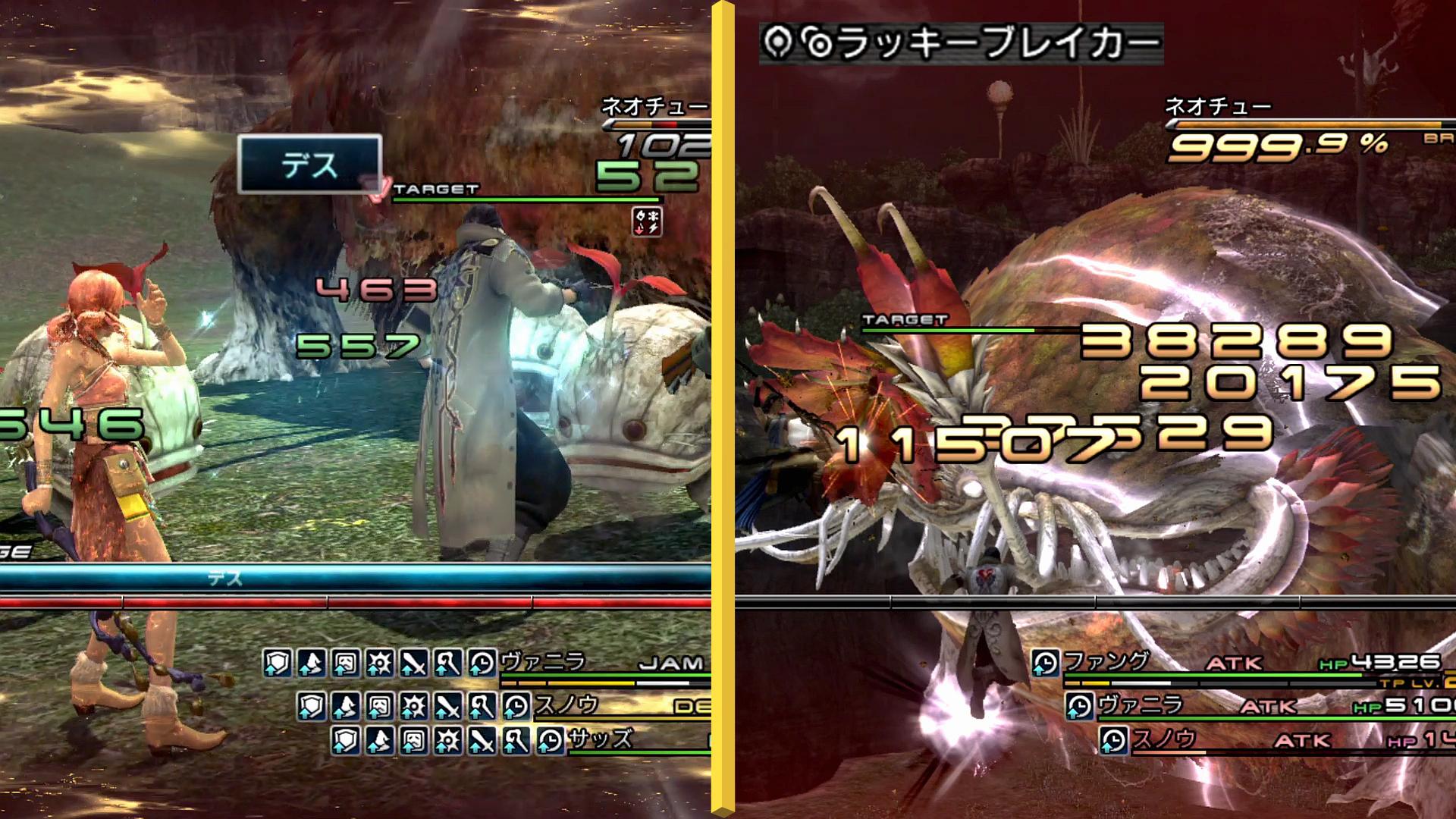――さらに、「たたかう」は基本の威力が「1.2」で変動率が1.00〜0.96のため、平均倍率は1.176倍である。いっぽう、ルインは基本の威力が「1.0」なうえ変動率が1.00〜0.91と下振れしやすいため、平均ダメージは0.945倍になる。これを、上記のパラメーター値に掛けると、物理攻撃は4900、魔法攻撃は3252という値になる。よって、物理攻撃のほうが1.5倍のダメージとなるため、モーション速度を考慮しても、「ルイン」を12発放つ時間で、「たたかう」を8発以上当てられれば、物理攻撃のほうが強力ということになる。実際のバトルでは、ライトニングの行動3セットごとのオプティマチェンジを行っていたが、その時間でファングの「ルイン」だと16発のところを、「たたかう」なら13発というところであったため、確かに計算上も「たたかう」のほうが威力が上になるということが分かる。