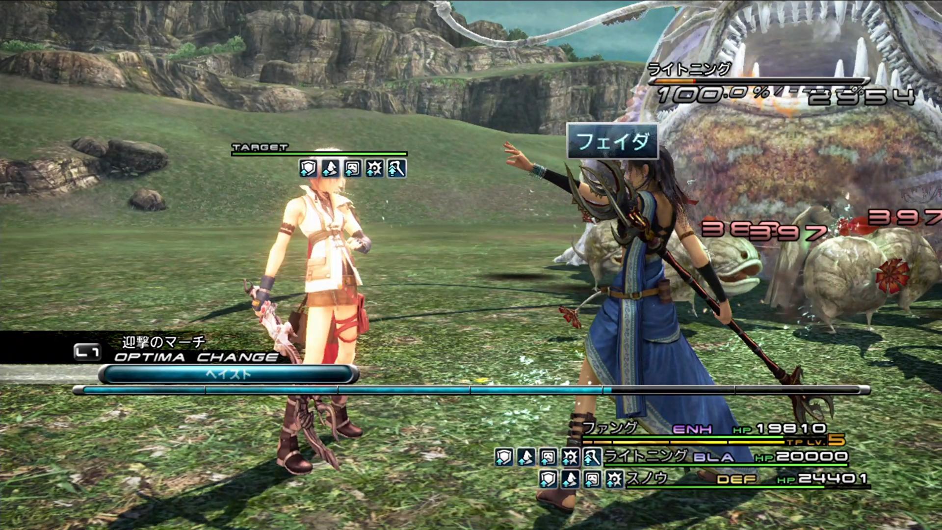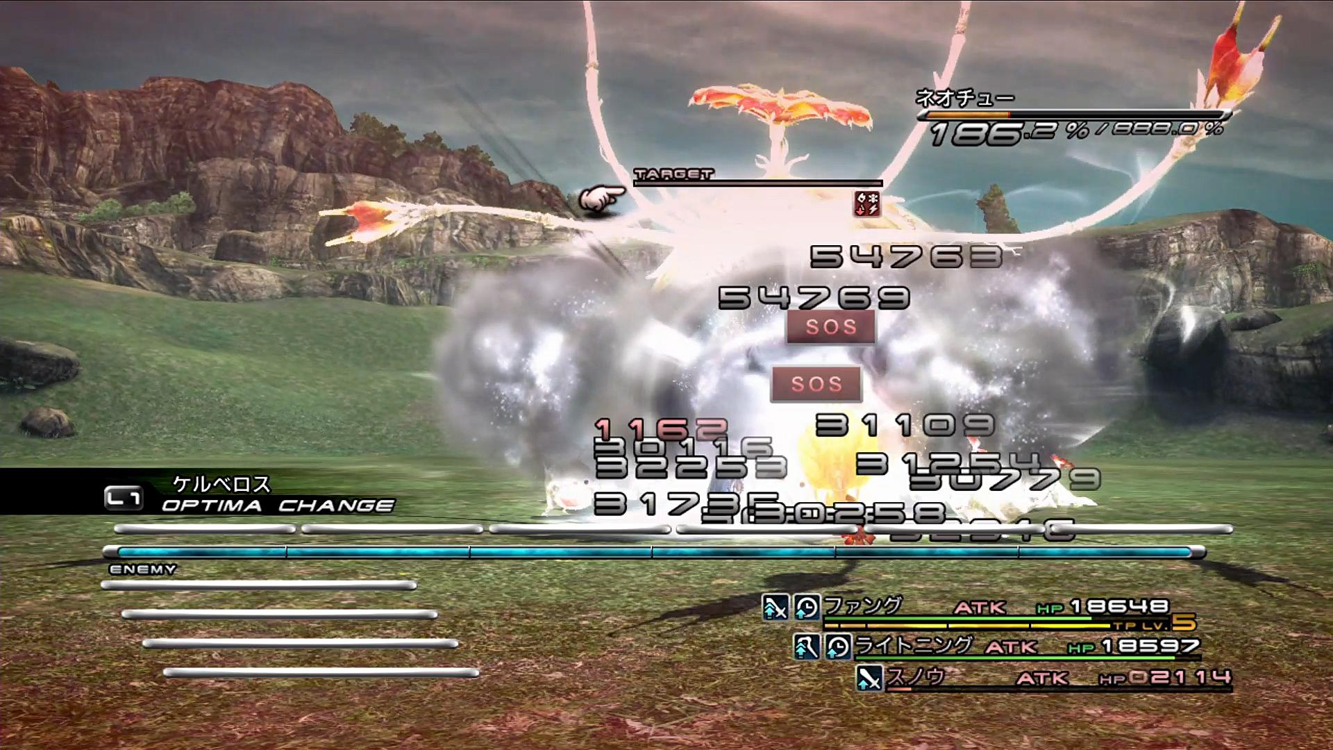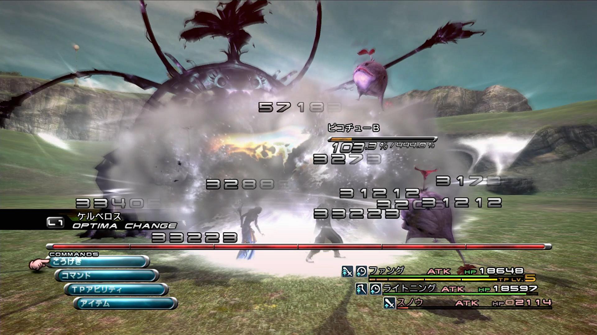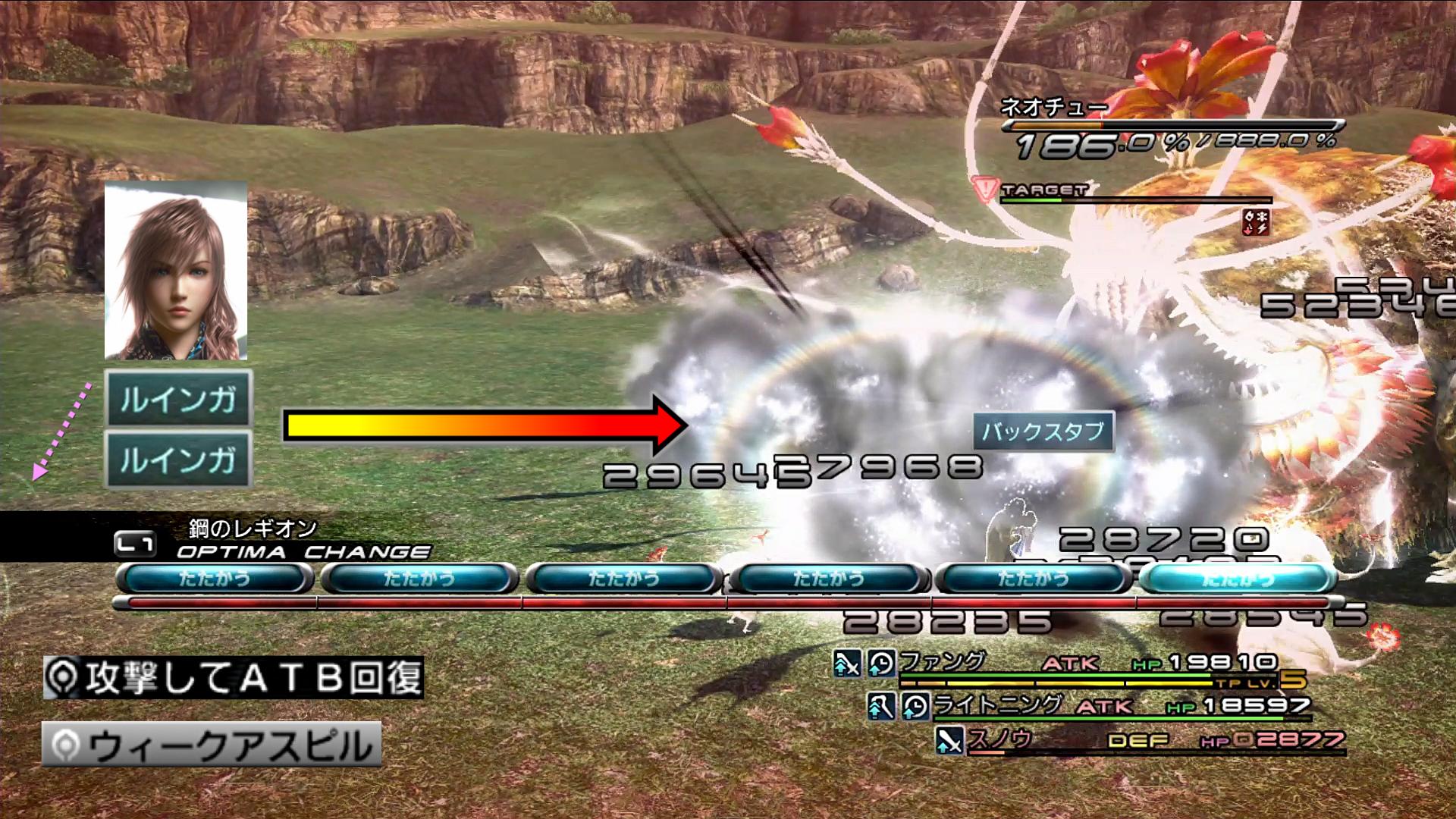 …ここでは、事前の段取り通り、ファングATKは「たたかう」で攻撃し、ライトニングBLAは魔法でチェーンを伸ばしていく。ファングは、地上であっても空中であっても、6発目の「たたかう」のモーションが遅いため、4発か5発に区切って攻撃をしていく。また、ライトニングは、「攻撃してATB回復」でゲージを回復しつつ、3セットの攻撃を加えてオプティマチェンジをする。そのため、必ず12秒ルールでの連続攻撃を適用して、時間短縮をしていく。
