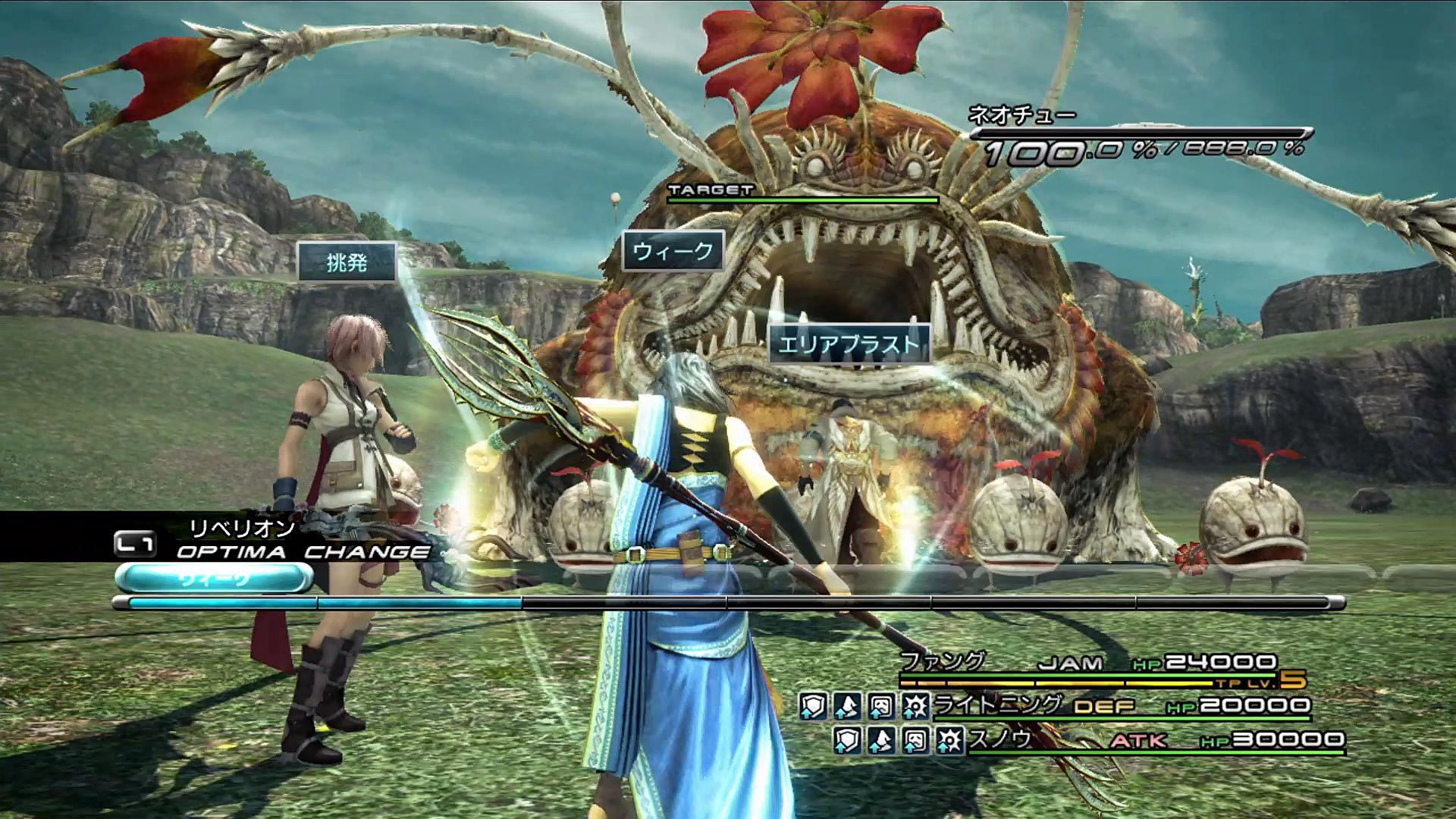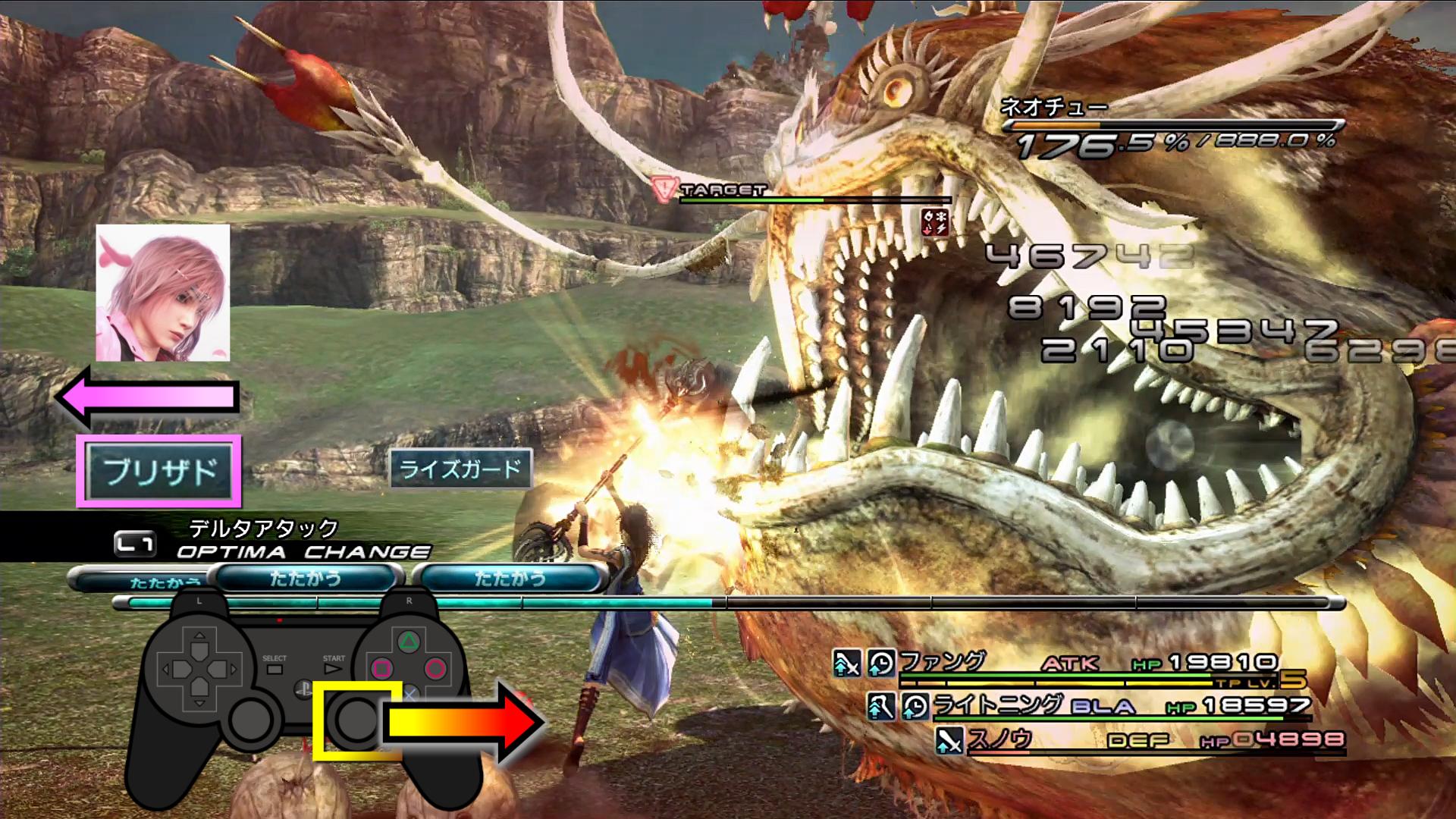 ――その他のキャラの行動としては、スノウは前進した位置で「挑発」を使い、敵の攻撃を引き付け始める。この際、「回避」を使用し、ネオチュー本体の方向へと移動してくれると、更に良い。また、余ったライトニングは、BLAでネオチュー本体を2セット攻撃する。これにより増やせるチェーンボーナスは20%ちょっとであるが、この後に当てる攻撃全てに上乗せされるため、このくらいの値でも無視できないのだ。