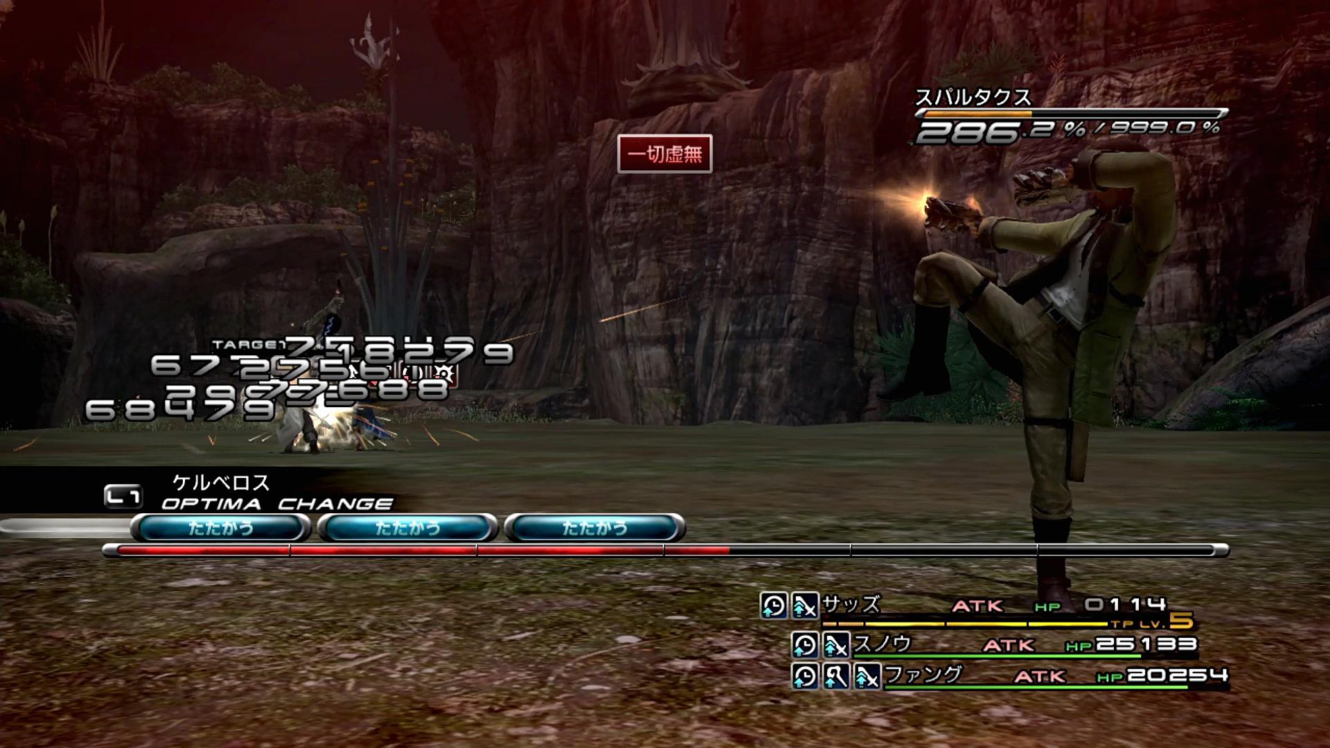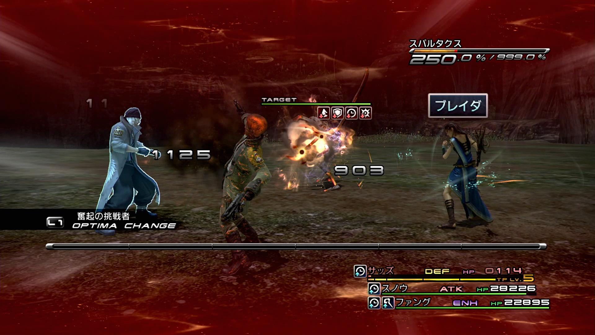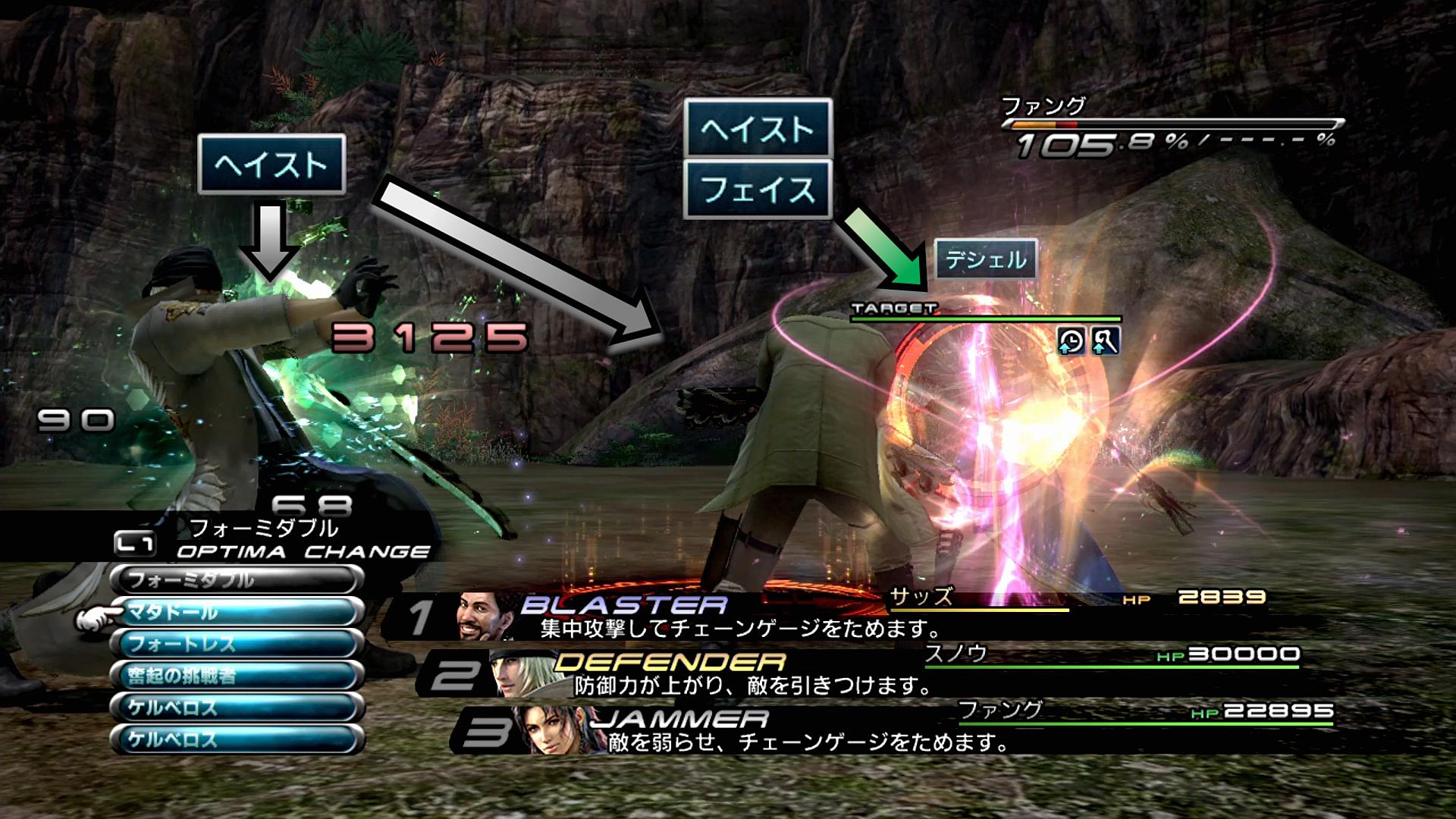 まず、開幕のオプティマは、サッズ・スノウ・ファングでの「ENH+ENH+JAM」とする。この陣形で、スノウENHは、「ヘイスト」をスノウ→サッズの順番に掛けていく。ファングについては、この段階で「ブレイダ」を発動させると、ATKで攻撃開始をして少し経ったくらいという最悪のタイミングで切れてしまうため、ENHではなく、JAMでチェーン時間を稼ぐのが妥当なところであろう。ちなみに、このように「ヘイスト」を優先して使ってくれるのは、PS3版ではVer.1.01のみであり、1.00では「プロテス」から使用するため、今回の私の戦法はアップデート後でしか行えないことになる。まあ、今更わざわざ旧バージョンを使うというのは、相当のこだわりがある人だけだと思うが、FF13はそれくらいこだわる価値のあるゲームであり、昔のタイムアタック動画ではVer.1.00を使っている場合も多いため、それらの違いは把握しておくと良いだろう。