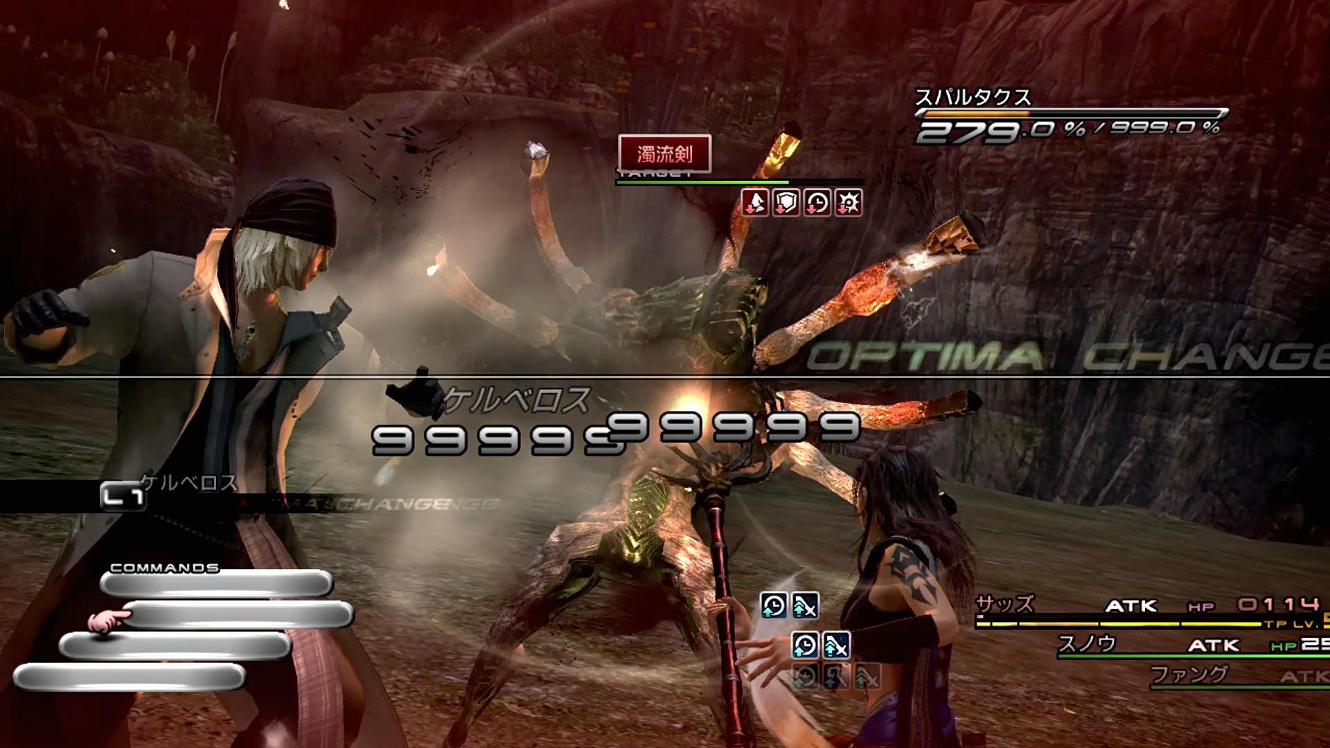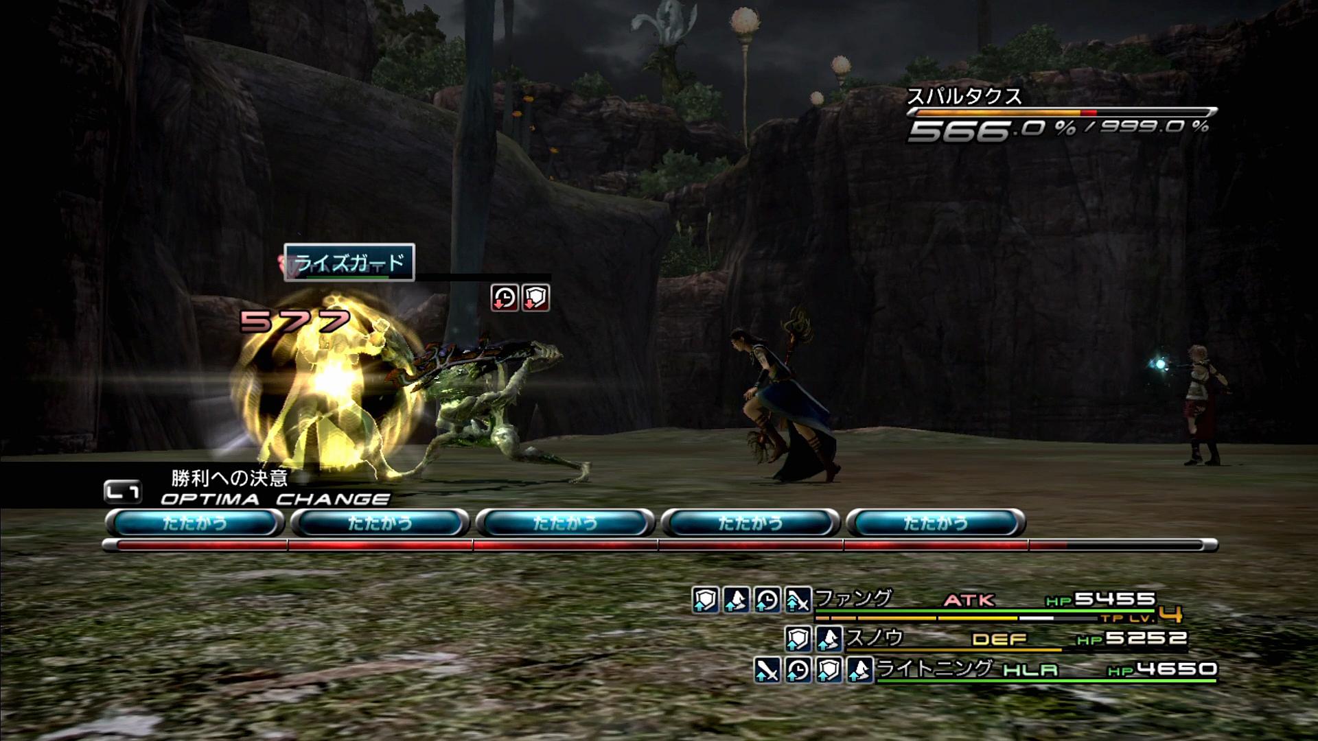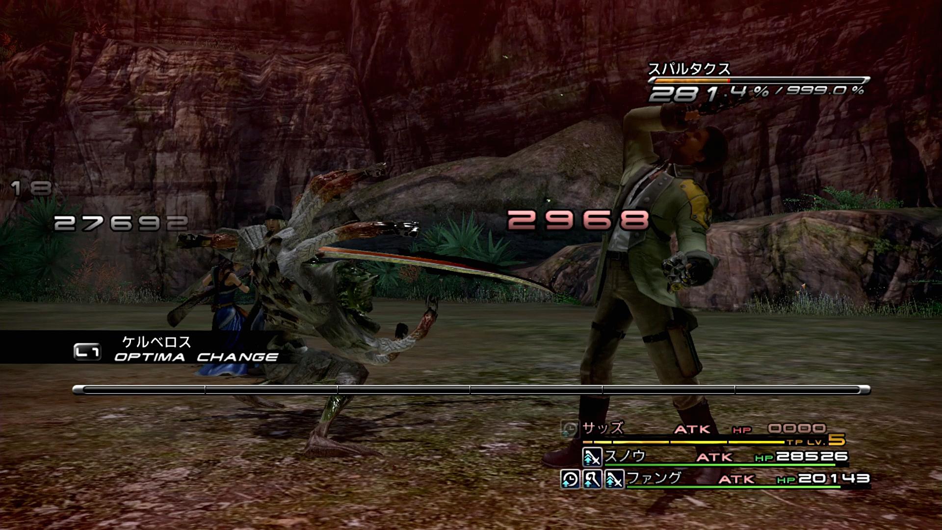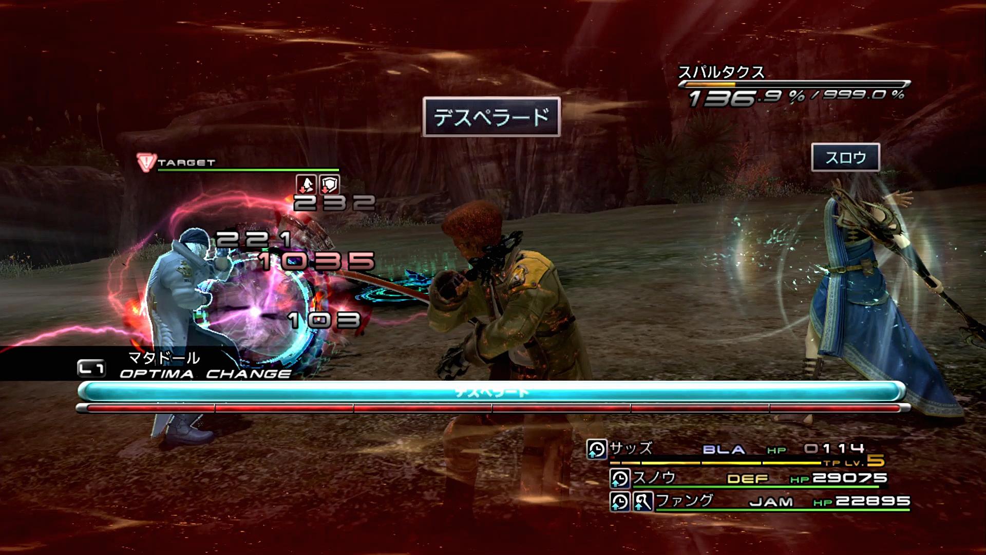 まず、開幕のオプティマは、サッズ・スノウ・ファングでの「ENH+ENH+JAM」とする。この陣形で、スノウENHは、「ヘイスト」をスノウ→サッズの順番に掛けていく。ファングについては、この段階で「ブレイダ」を発動させると、ATKで攻撃開始をして少し経ったくらいという最悪のタイミングで切れてしまうため、ENHではなく、JAMでチェーン時間を稼ぐのが妥当なところであろう。ちなみに、このように「ヘイスト」を優先して使ってくれるのは、PS3版ではVer.1.01のみであり、1.00では「プロテス」から使用するため、今回の私の戦法はアップデート後でしか行えないことになる。まあ、今更わざわざ旧バージョンを使うというのは、相当のこだわりがある人だけだと思うが、FF13はそれくらいこだわる価値のあるゲームであり、昔のタイムアタック動画ではVer.1.00を使っている場合も多いため、それらの違いは把握しておくと良いだろう。