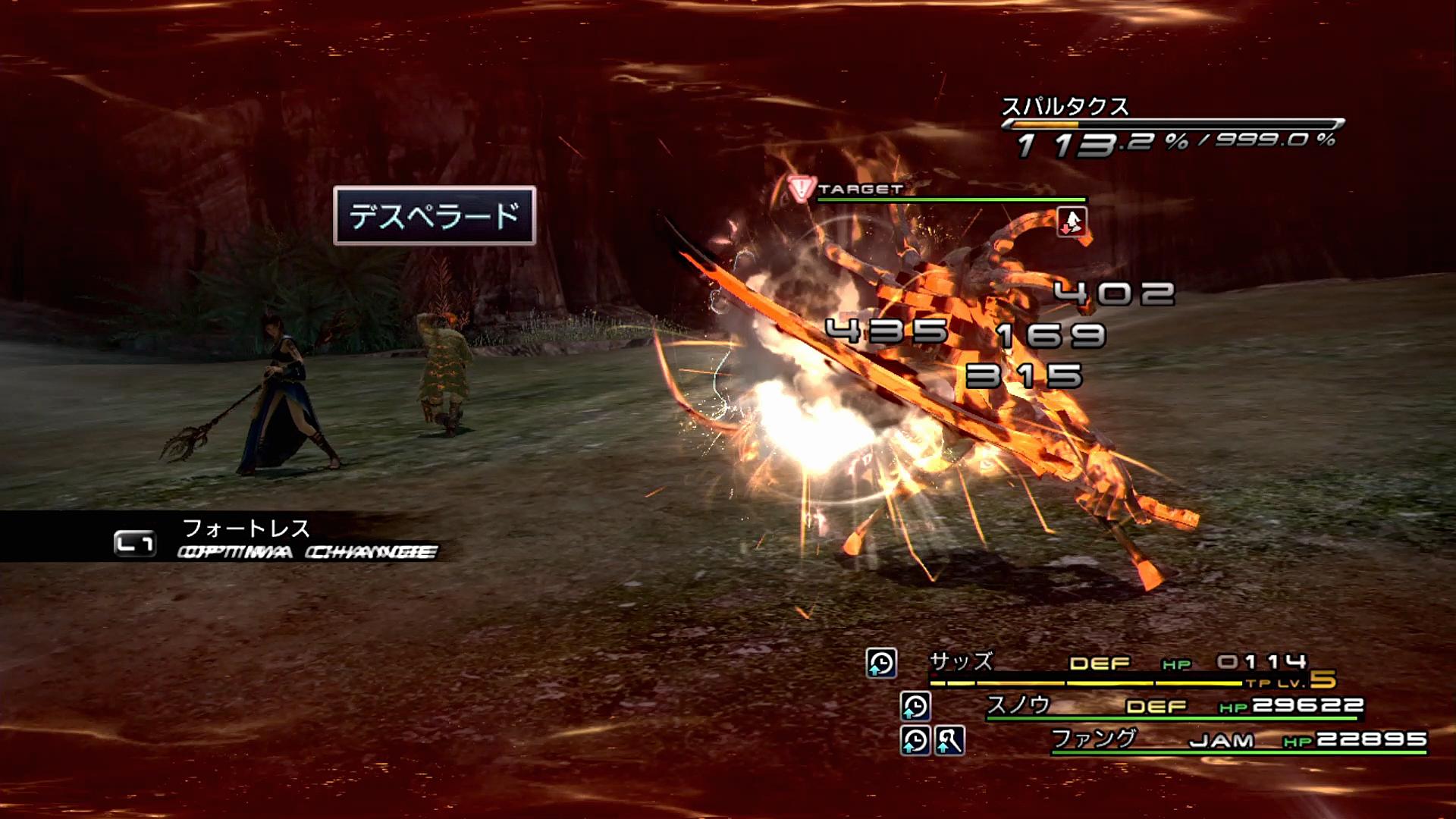 …さて、今回の敵で、皆さまが期待されているのは、サッズ(良すぎ)作戦であろう。その内容は、「サッズが、BLAのデスペラードを使い、その攻撃をDEFで適用する」というものであり、“DEFで物理攻撃を行ったときのボーナス”により、敵の耐性を貫通してチェーンボーナスを伸ばすことができる。このテクニックを使うことにより、前回のラクタヴィージャ×2では、既存の最速記録から40秒という大幅な短縮を達成した。そして、今回のスパルタクスも、ラクタヴィージャと同じくチェーン耐性が「100」であるため、サッズ(良すぎ)作戦で、段違いに効率良くバトルを進められるように思えたのである。