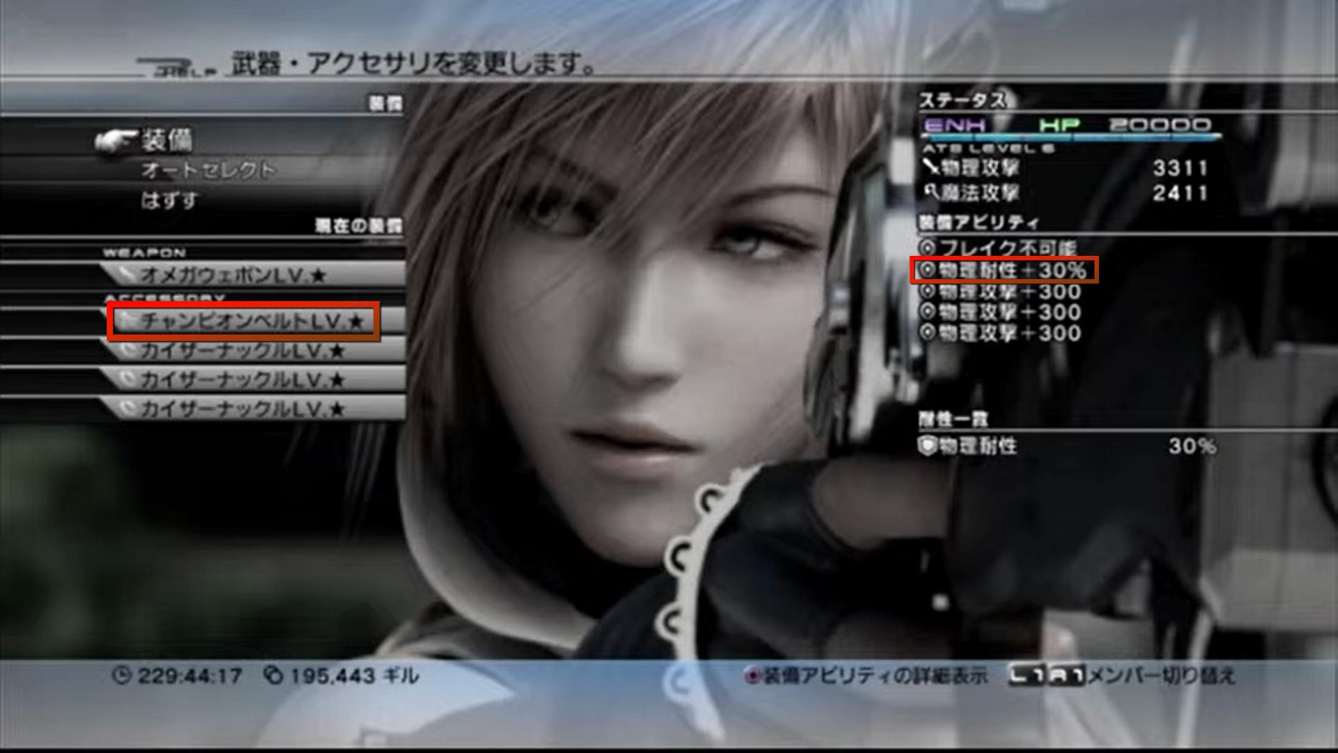 …ただ、動画に収録されている戦法にはミスがあり、ライトニングが「カイザーナックルLv.★」ではなく、1個だけ「チャンピオンベルトLv.★」(物理耐性+30%)を装備している。なに、防御力が高いほうが「ハイボルテージ」を維持しやすいから…と言いたいところだが、ライトニングにはハイボルテージは無い。また、武器についても、「ブレイク不可能」武器で物理攻撃力を+711としているが、実は物理特化武器のほうが+723とほんの僅かだけ火力が高い。よって、氏の2分12秒の記録では、物理攻撃力を312失っていることになる。これは、ひょっとしたら意図的な設定なのかもしれないが、私にはミスであるようにしか思えない。他兄貴の攻略でも、「チャンピオンベルト」を装備している例がちょくちょくあるのだが、何が何やら…。