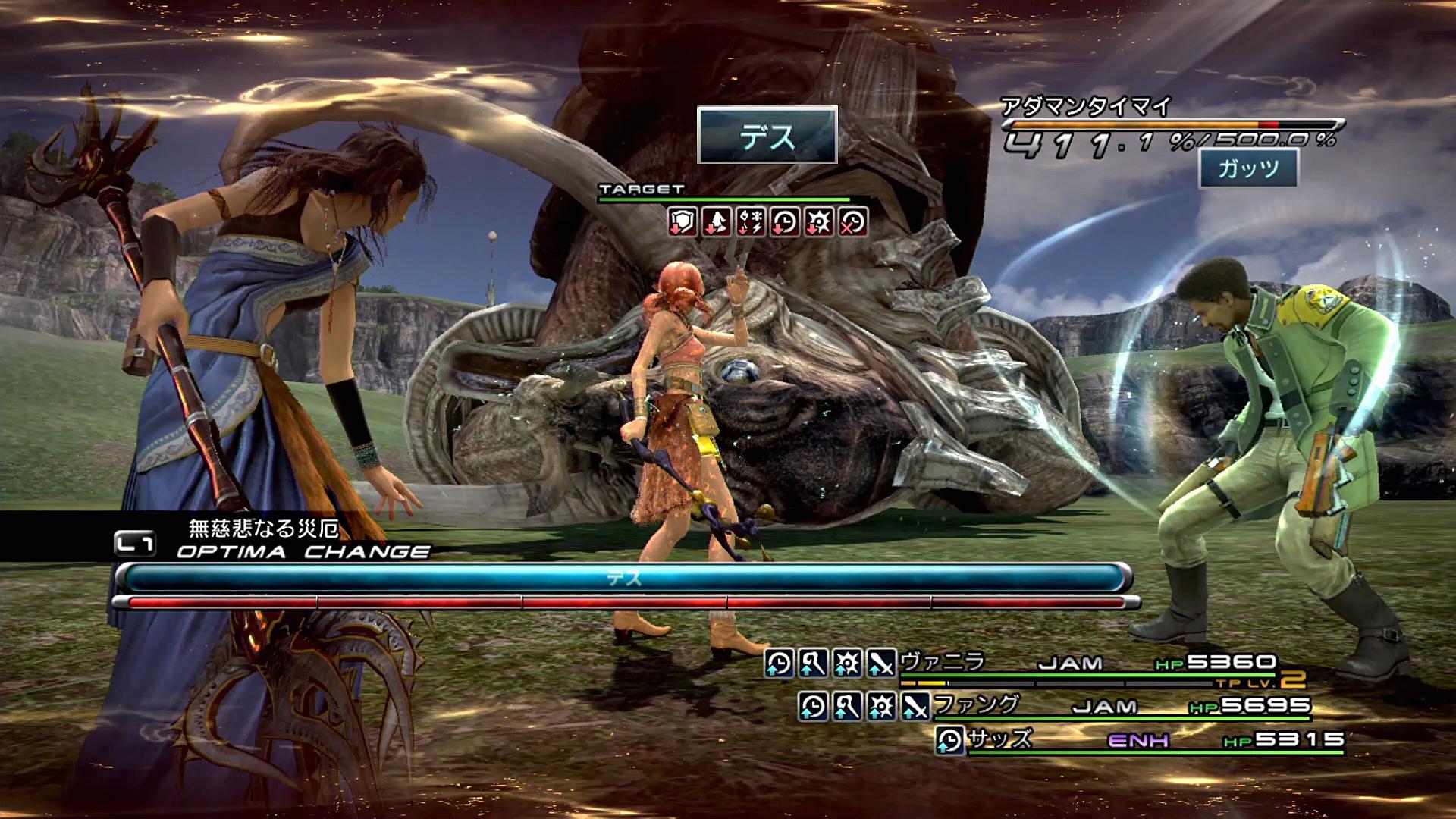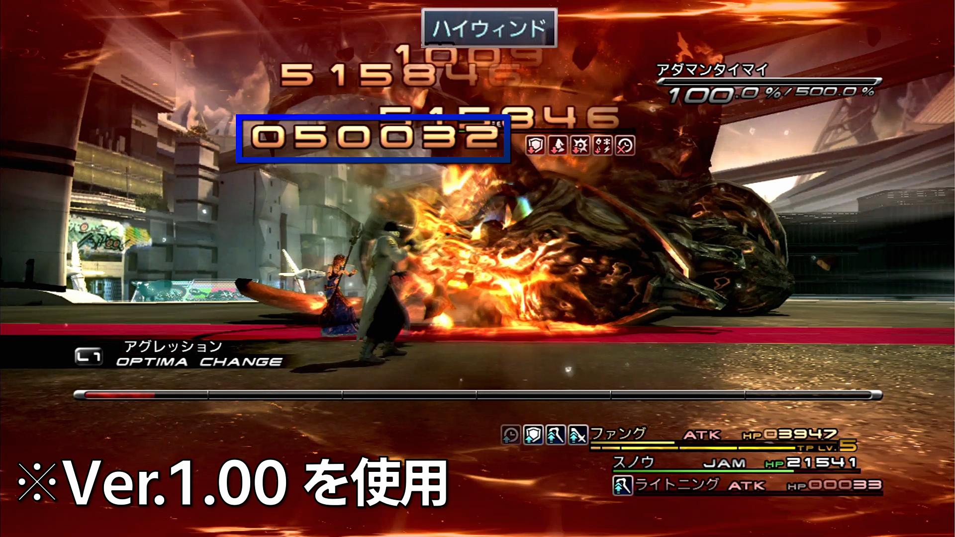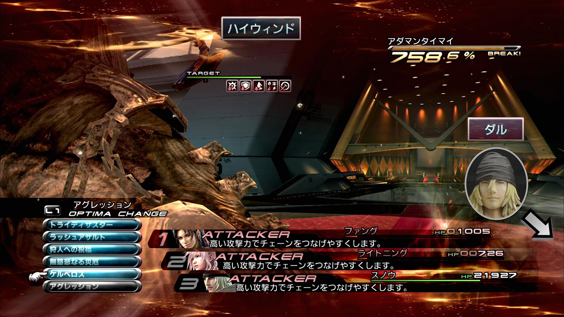 ――それを防ぐためには、攻撃オプティマである「ATK+ATK+JAM」に変える際に、ライトニングが12秒ルールでの連続攻撃を適用すれば良い。そして、それを行うためには、更にそこから振り返って、「ENH+JAM+JAM」→「BLA+BLA+BLA」と変更する時に、ライトニングが連続攻撃を実施しない必要がある。そうすれば、ファングがBLAでの「ファイア」「ブリザド」「ファイア」「ブリザド」「ブリザラ」を2回入力してオプティマチェンジをすることで、「ATK+ATK+JAM」に変えた際に、ライトニングが連続攻撃をしてくれ、「ハイウィンド」に先回りして「ルイン」を6発当ててくれると思う。もう何が何だか私もよく分かっていない。一つ言えることは、★運★である。やれ、「奇跡はうちらの得意技だ」という言葉は、「FF13を極めたいなら運ゲーを頑張れ」という意味だった…?