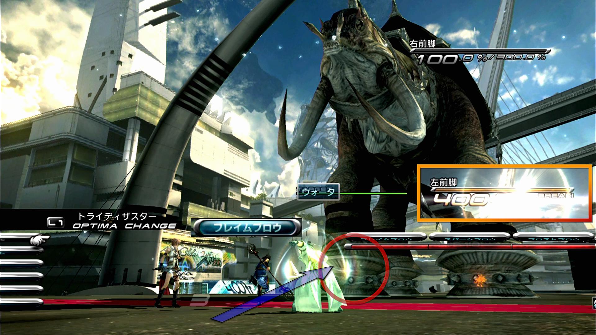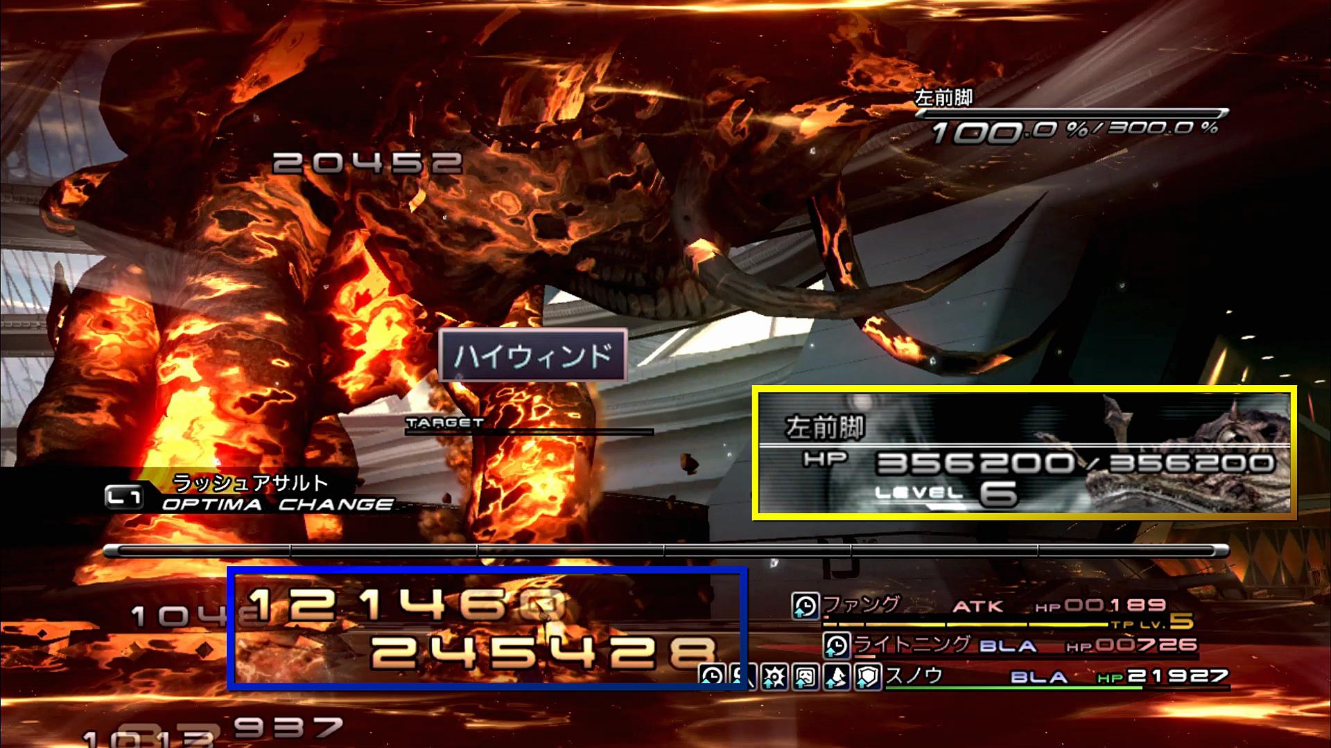 …ここでは、まず左側の脚のほうに、ライトニングとスノウが続けてBLAで攻撃をしてくれるので、ファングは右側の脚にターゲットを切り替えて、「ハイウィンド」を放つ。その間に、左側の脚もブレイクされるため、そちらにターゲットを変えて「ハイウィンド」を放つ。これにて、脚を砕くパートは終了である。速い、速すぎる!!!