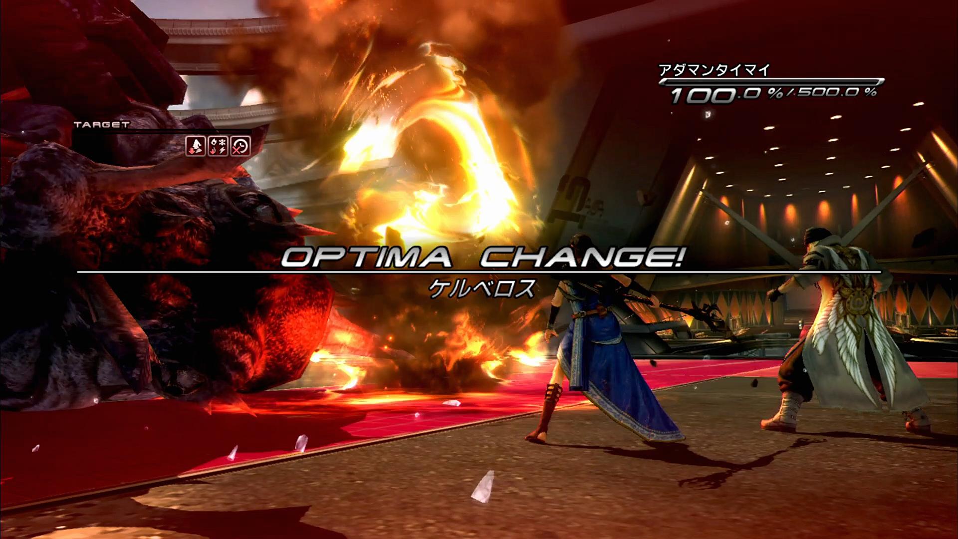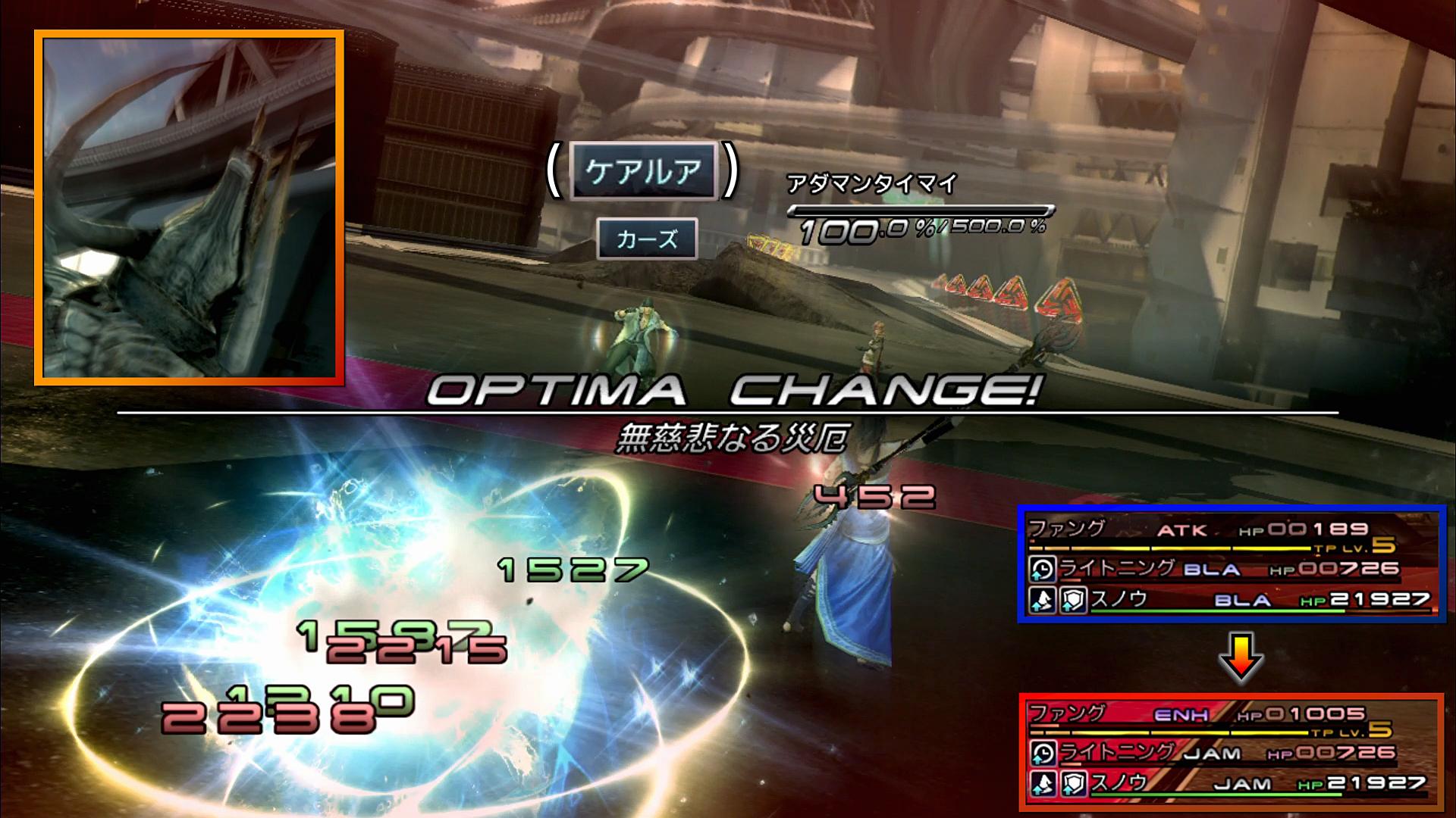 ――というわけで。オプティマとしては、(「ATK+BLA+BLA」→)「ATK+JAM+HLR」→「ENH+JAM+JAM」とし、オプティマチェンジによってスノウの回復行動を中断することで、ファングのHPを調整していく。タイミングは、「ケアルア」の文字が表示された瞬間にオプティマを変えると、ケアルアの使用回数が1回になるので、そこから少しずつ遅らせることで調整をしていくと良いだろう。