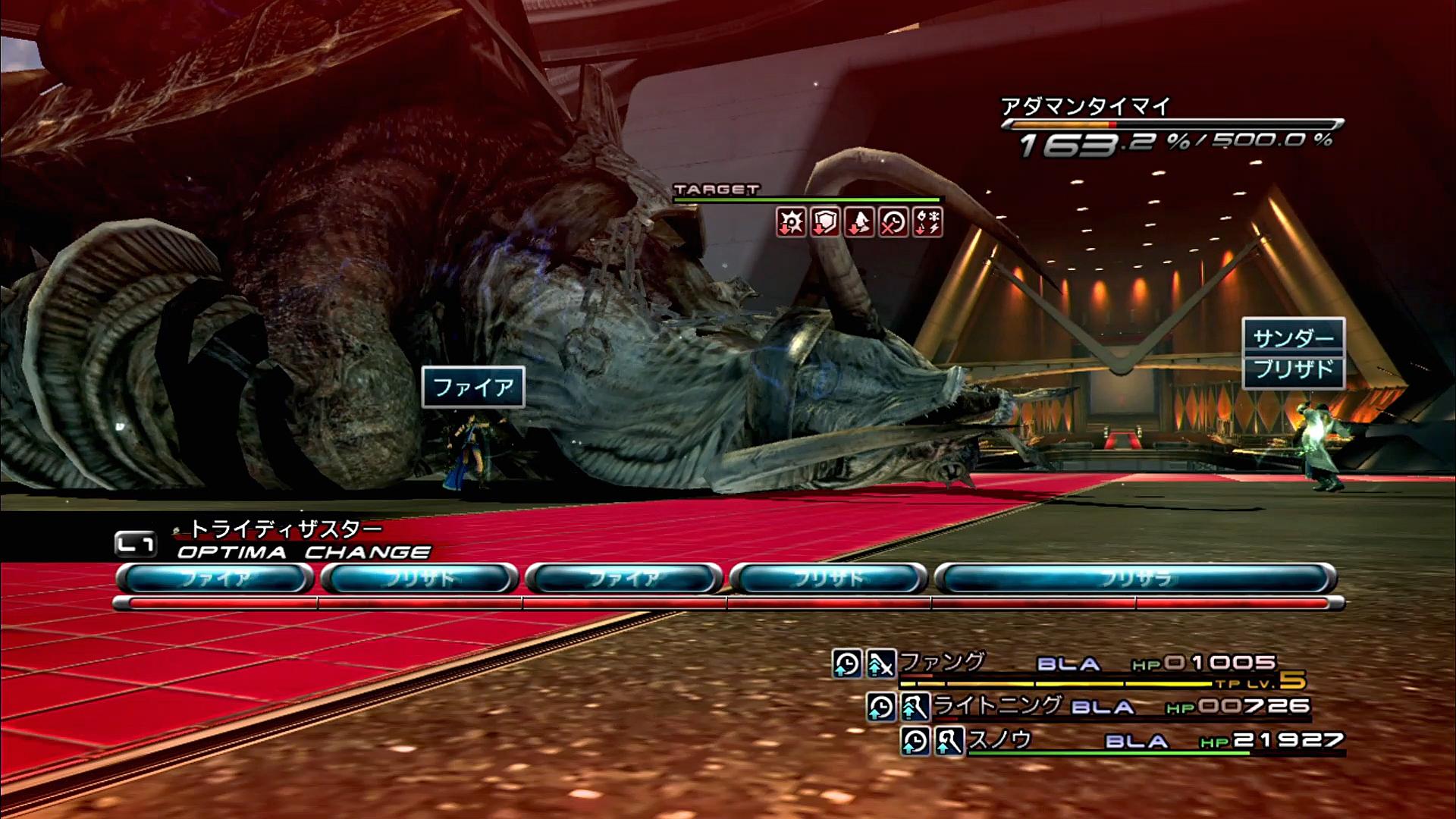 …何故かと言うと、使うオプティマは「ENH+JAM+JAM」なのだが、ここでファングENHが「自分にブレイダ」→「ライトニングにフェイダ」と行動する僅かな間に、必要なステータス魔法を全て成功させなければならないからである。転倒した亀とはいえ、ステータス耐性が0となるわけではない。だが、敵は全属性を半減するため、最速を目指すのならば、「ウィーク」を発生させるタイミングはここしかないのである。