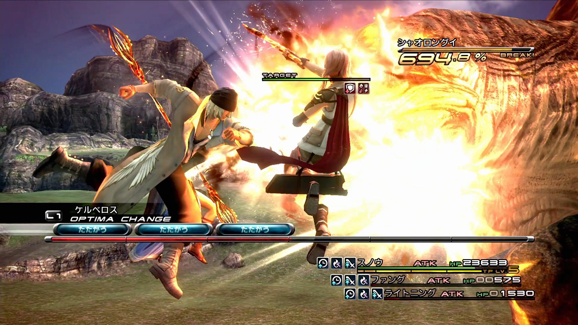 …まず、1個目のトライディザスターでは、ファングは△ボタンを使わず○ボタンでオートコマンドを決定し、ブロウ系を6回入力する。これにより、敵の足踏み攻撃を避けつつ、安定したペースでチェーンを伸ばすことが可能である。なお、ライトニングについても、3回の「エンファイ」を使用したが、このパターンだと高確率で攻撃を回避できるようだ。ライトニングについては、HPをギリギリまで切り詰めており、踏まれてしまうとアウトなため、ここで回避可能なのは嬉しい限りである。この攻撃により、チェーンを180%→360%と伸ばしていける。