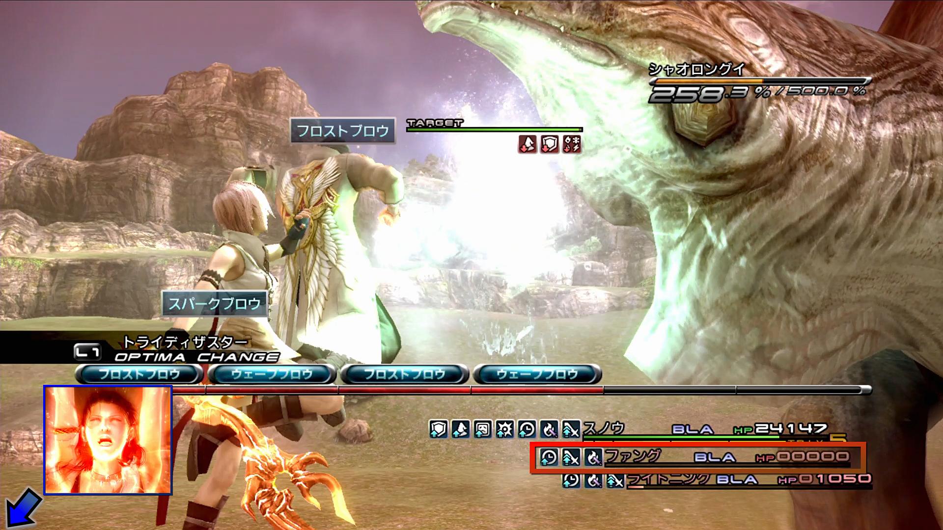 具体的なコマンド入力としては、まずファングは、オートコマンドを選び、「↑+△」と押せば、「ライトニングに対するブレイダ」を使ってくれる。この際、速く入力しすぎると、ファングへのブレイダとなってしまうことがあるため、気を付けたい。