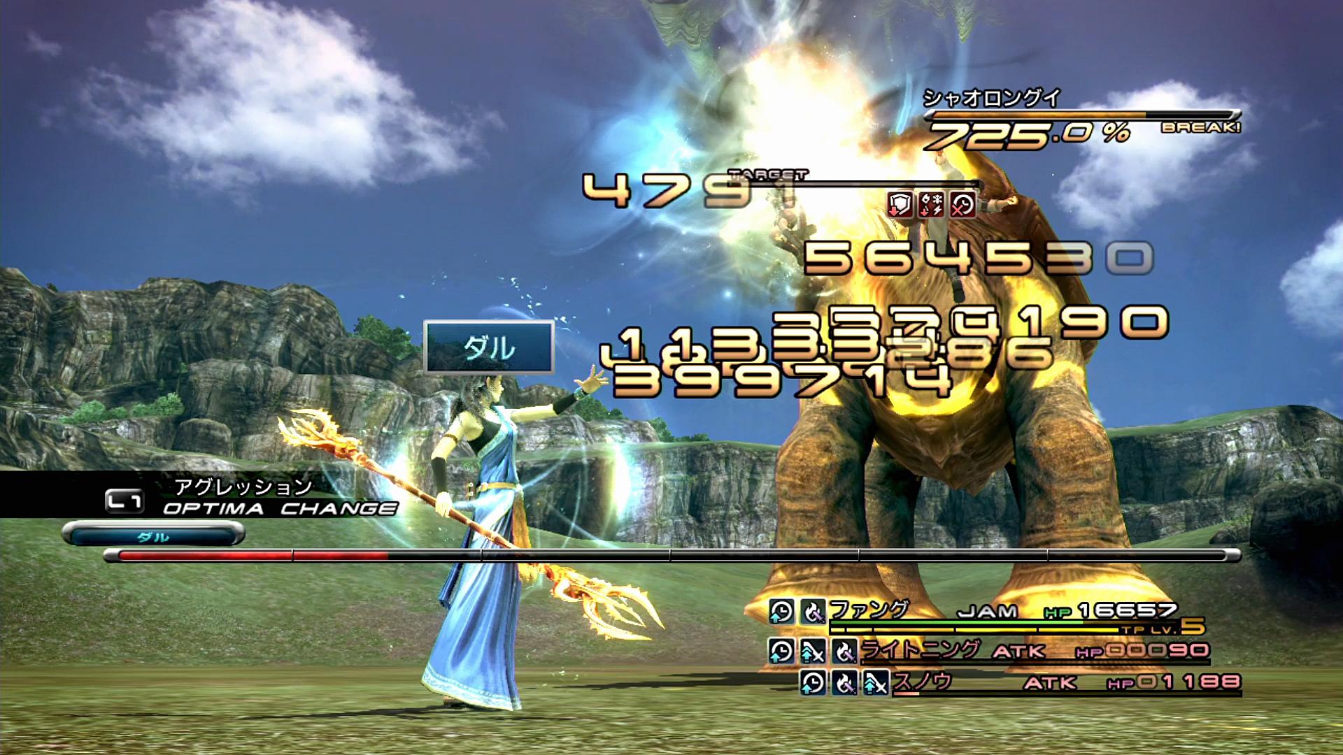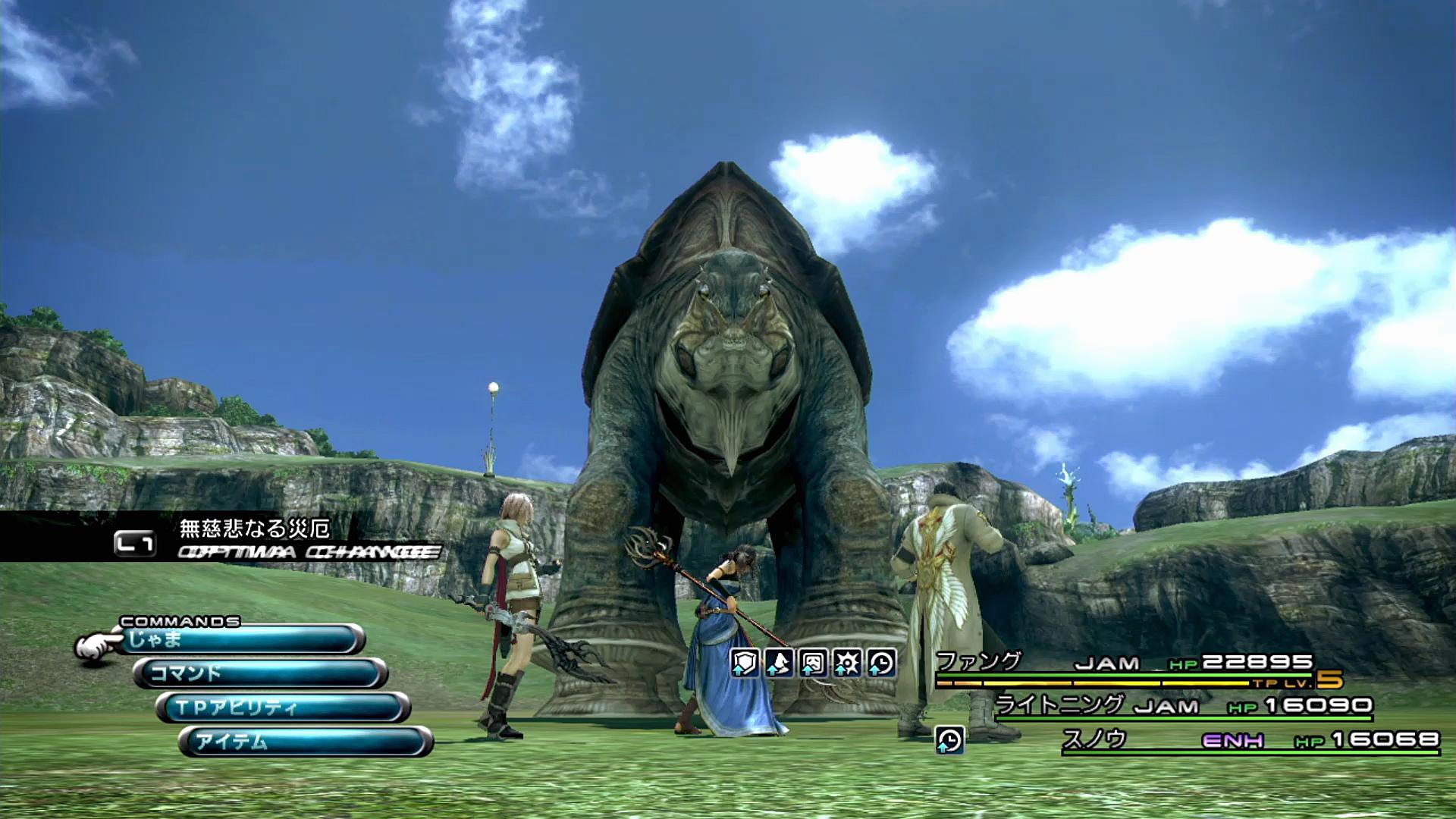 …この際、JAMのファングとライトニングは「閃光のスカーフ」でロケットスタートを決めているため、ここで一気に「デプロテ」と「ウィーク」を掛けることを狙っていく。ファングJAMは、いつものように追加アビリティを制限しているので、「デプロテ」「ウィーク」のみを放ってくれる。ライトニングは、それに加えて「デシェル」も唱えるが、魔法攻撃はほとんどダメージ源とならない(敵の魔法耐性が「耐久」のため)ので、残念ながら無駄行動である。
