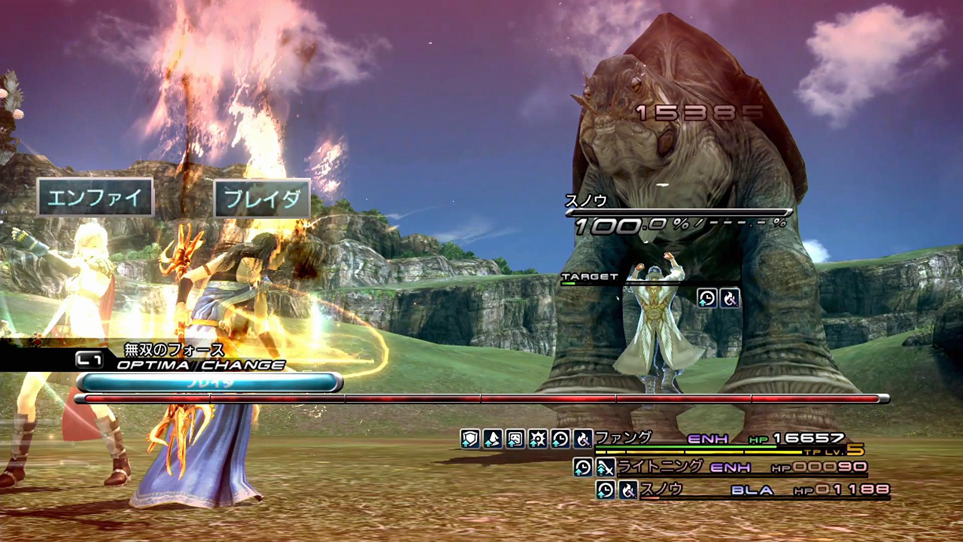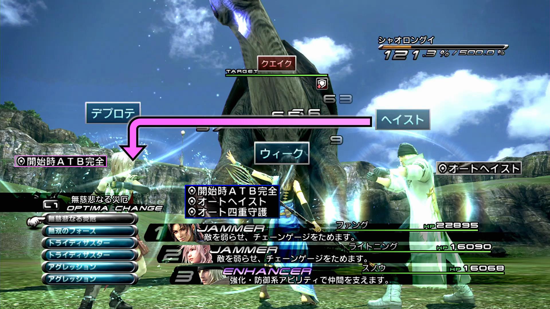 …さて、皆さまが気になるのは、もちろん「エンファイは3人なのに、ブレイダは2人?」ということであろう。ここが、ファングリーダー作戦のキーポイントである。最終的な攻撃で使うのは「JAM+ATK+ATK」であり、リーダーのファングは火力を上げる必要がない。しかし、AIに任せると、必要な2名だけに補助を絞れず、どうしても3人掛けるようになってしまう。そこで、ライトニングとファングのENHのうち、特に行動が遅かったファングをリーダーとし、火力が必要なライトニングとスノウにのみブレイダを使っていく。これで、足踏みの空中回避が間に合うくらいに、強化時間を短縮できるのである。