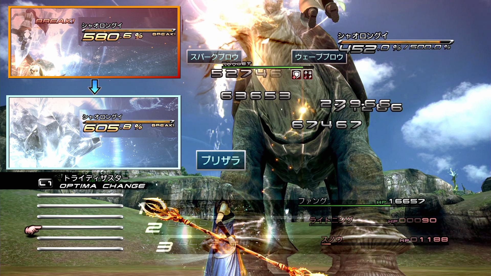――が、そこに来て、何故ボタン入力回数の少ない「ファイラ→ブリザラ→ファイラ(またはサンダラ)」ではなく、「ブリザラ→ファイラ→ブリザラ」と入力しているかと言うと、ブリザラはダメージ発生が遅いため、ブレイク後に命中してくれるからである。ちょうどこの辺りで、ライトニングの「早期ブレイク」によって敵をブレイクできるため、その後にブリザラを当てられれば、ラ系の「ブレイク中はチェーン上昇値が高まる効果」を適用でき、かなりのお得感が出てきてくれる。こうして“塵を集めて山にする”ことで、最後の1秒を縮められたりするのだ。