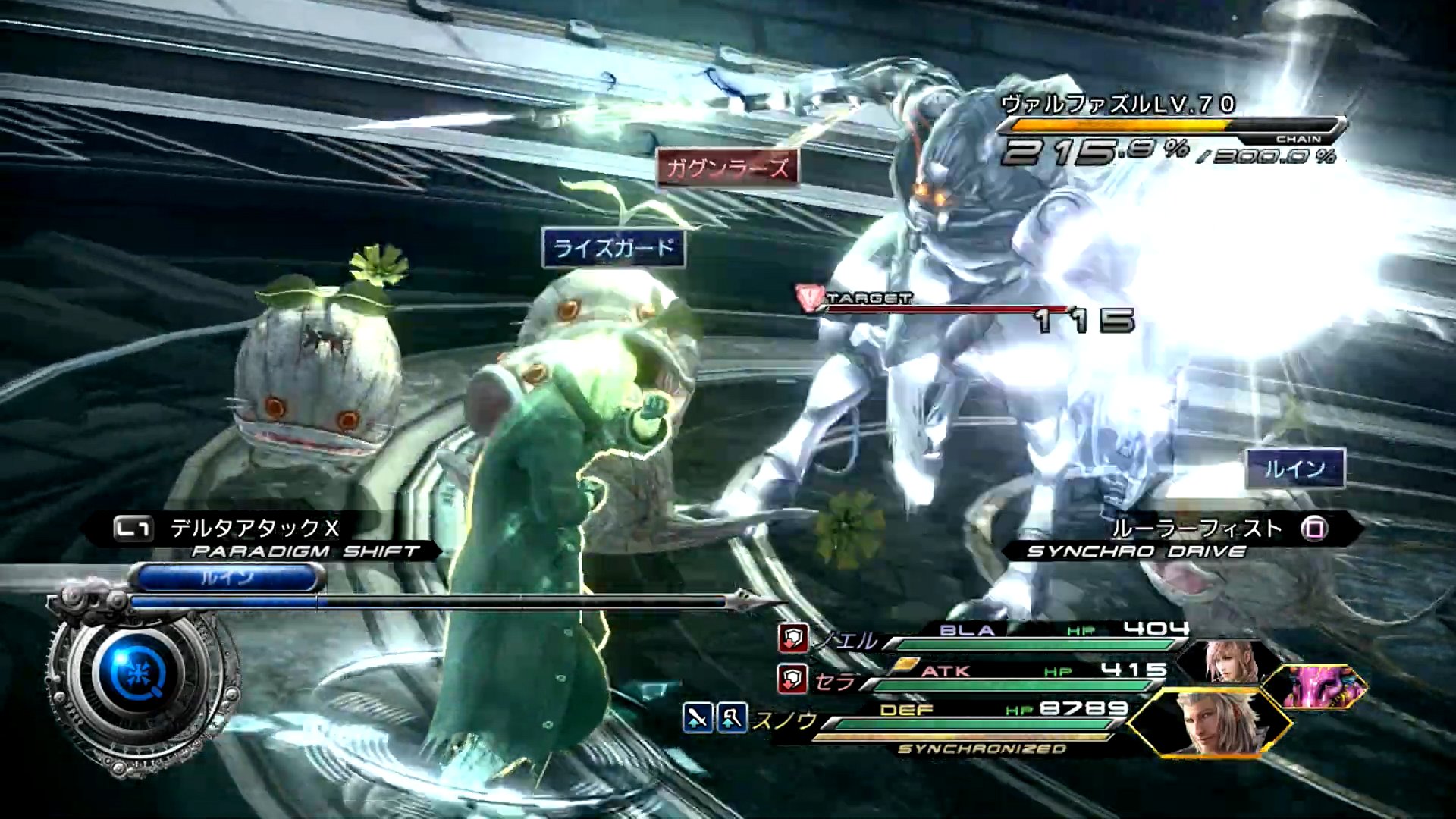 …まず、私のプレイだと、このタイミングで12秒ルールが発動してしまう。よって、ライトニングとスノウは、倒れ込んでいくロングイ本体に「チェーンスターター」を交えた「ルイン」を打ち込んでいくのだが、この時点ではほぼダメージが与えられないので、残念ながら無駄行動である。一応、その後のBLAが、1発目の行動として「サンダー」を選んでしまうと、チェーンが流れてしまうため、それを防げるという意味もあるにはあるが、それくらいだ。