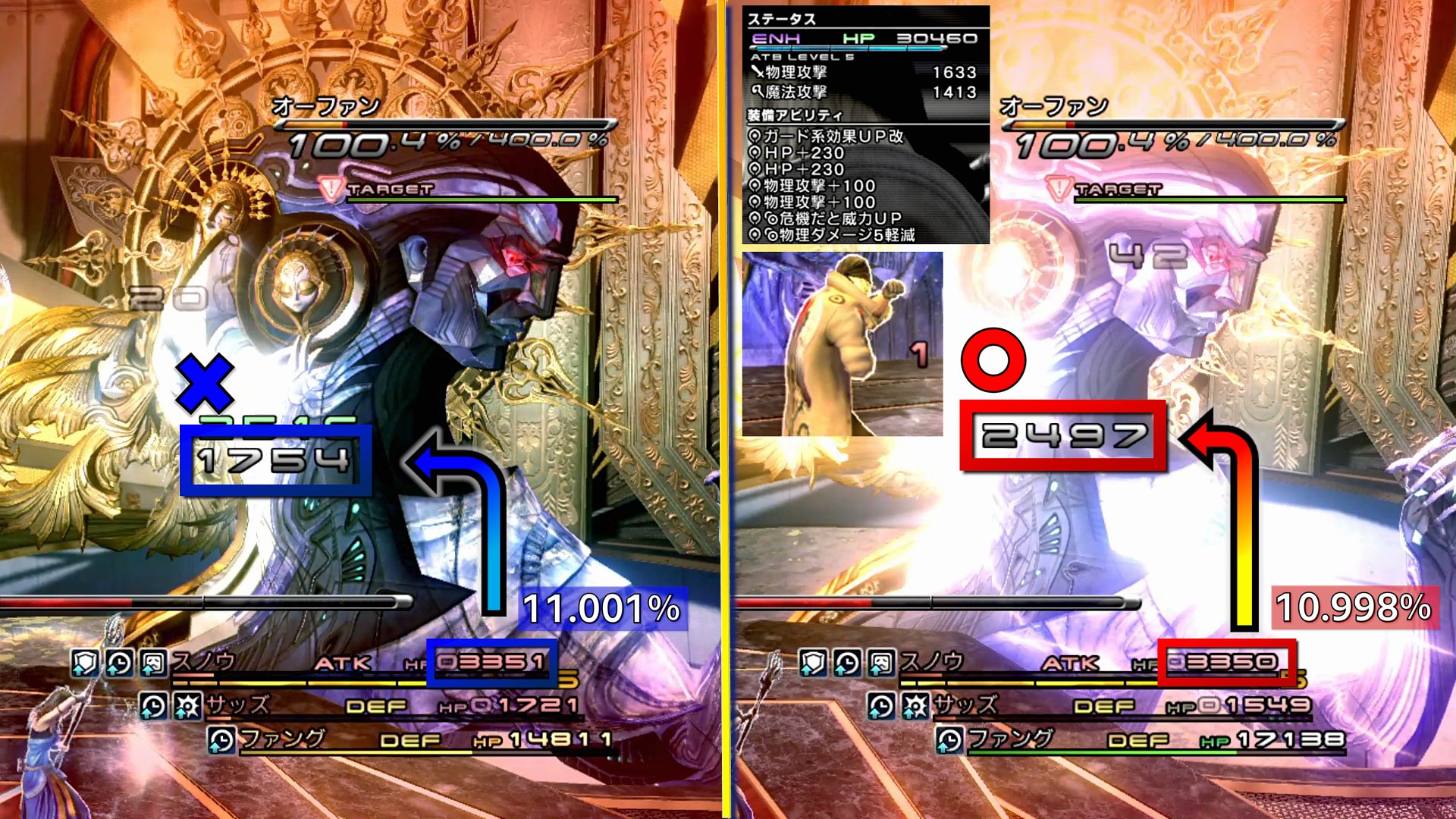 …まず、少し考察を進めれば分かるのが、HPは高ければ高いほど良いということだ。HPが高いと、今回の瀕死条件である「HP11%未満」の範囲も増えるため、ランダムダメージでそこに入りやすくなる。よって、ヴァニラ・ライトニング(+検討段階では使っていたホープ)については、他の作戦に支障のない範囲で、できる限りHPを高くするほうが良い。