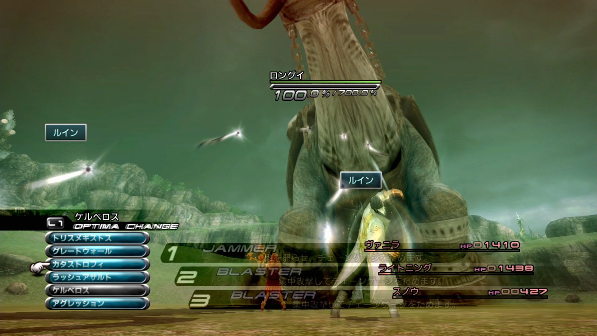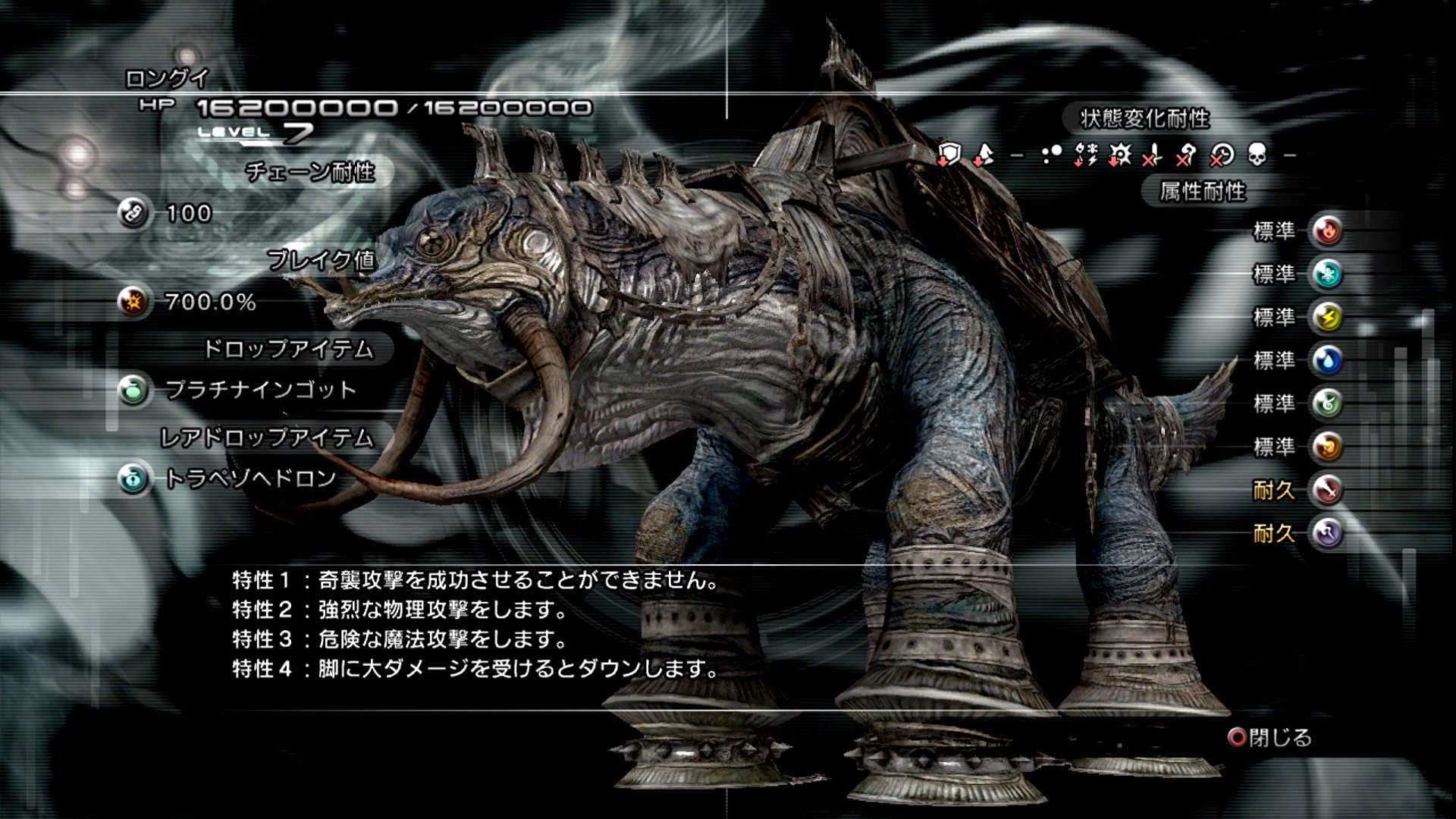 いっぽうで。ロングイは、PS3版のFF13における「トロフィー」の条件にもなっており、正攻法以外にも、様々な撃破パターンが考えられる。