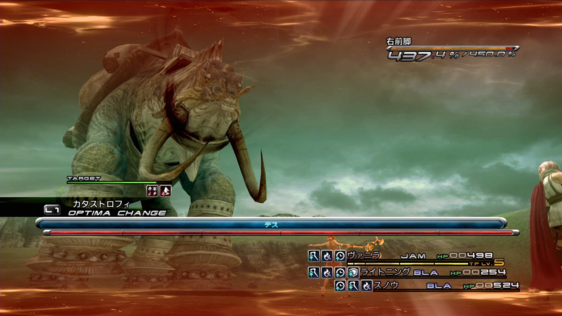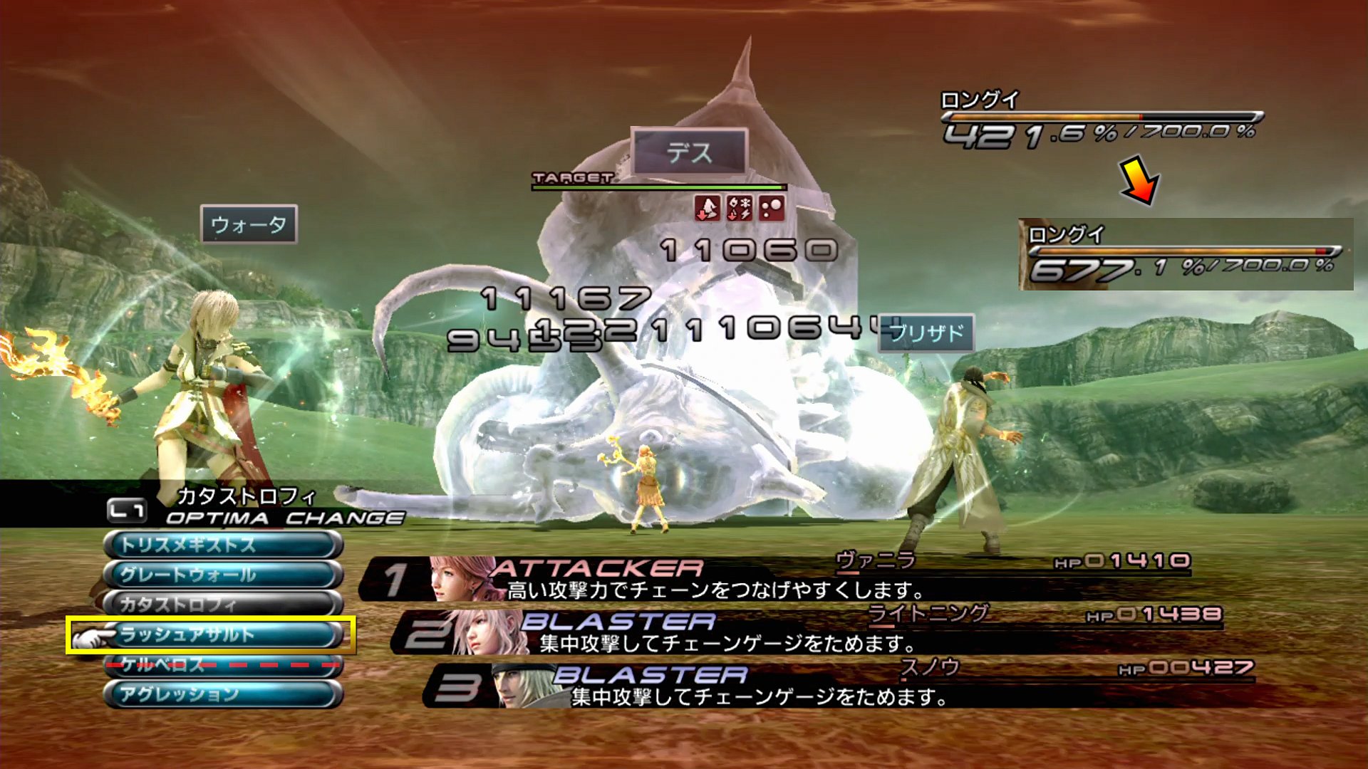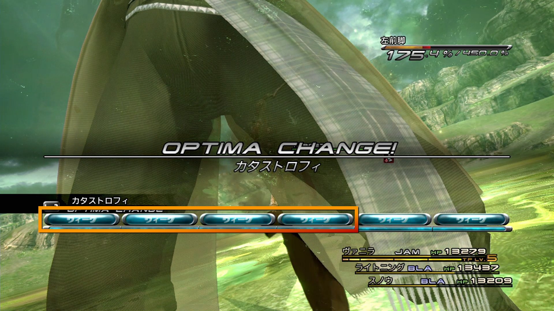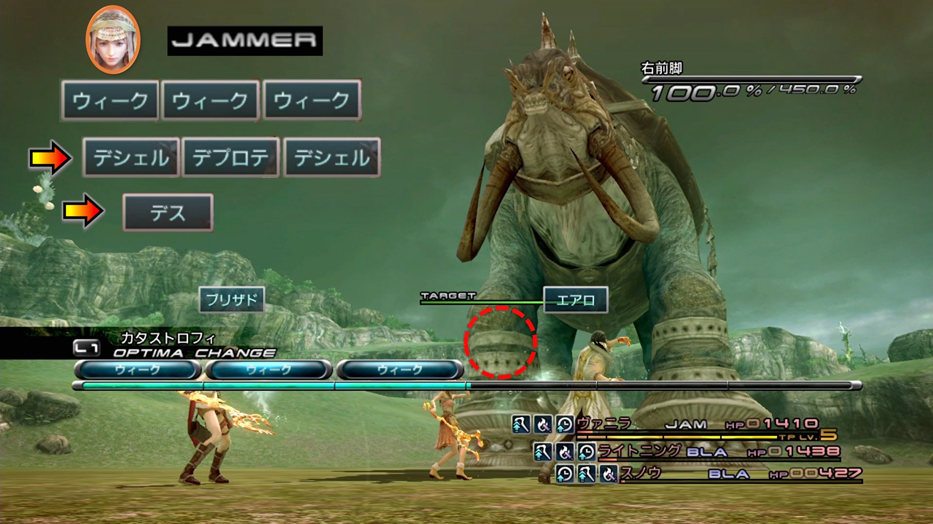 では、この、1本目の脚を狩り取るパートでの行動である。ENHでの強化後、12秒ルールを適用可能な「JAM+BLA+BLA」に変え、リーダーのヴァニラは「デス」を確定させ、ライトニングとスノウが6発目のBLA魔法を宣言したら、「ATK+ATK+ATK」に変更していく。以上である。