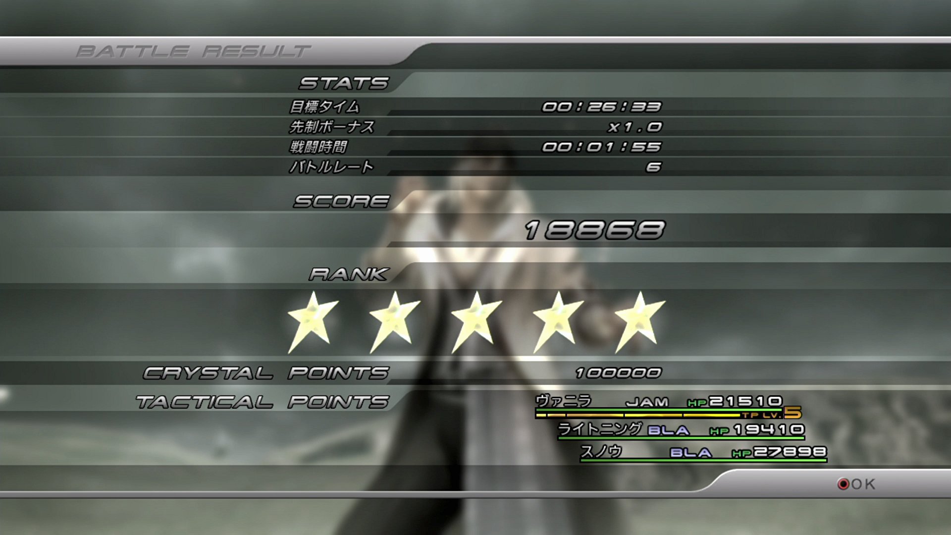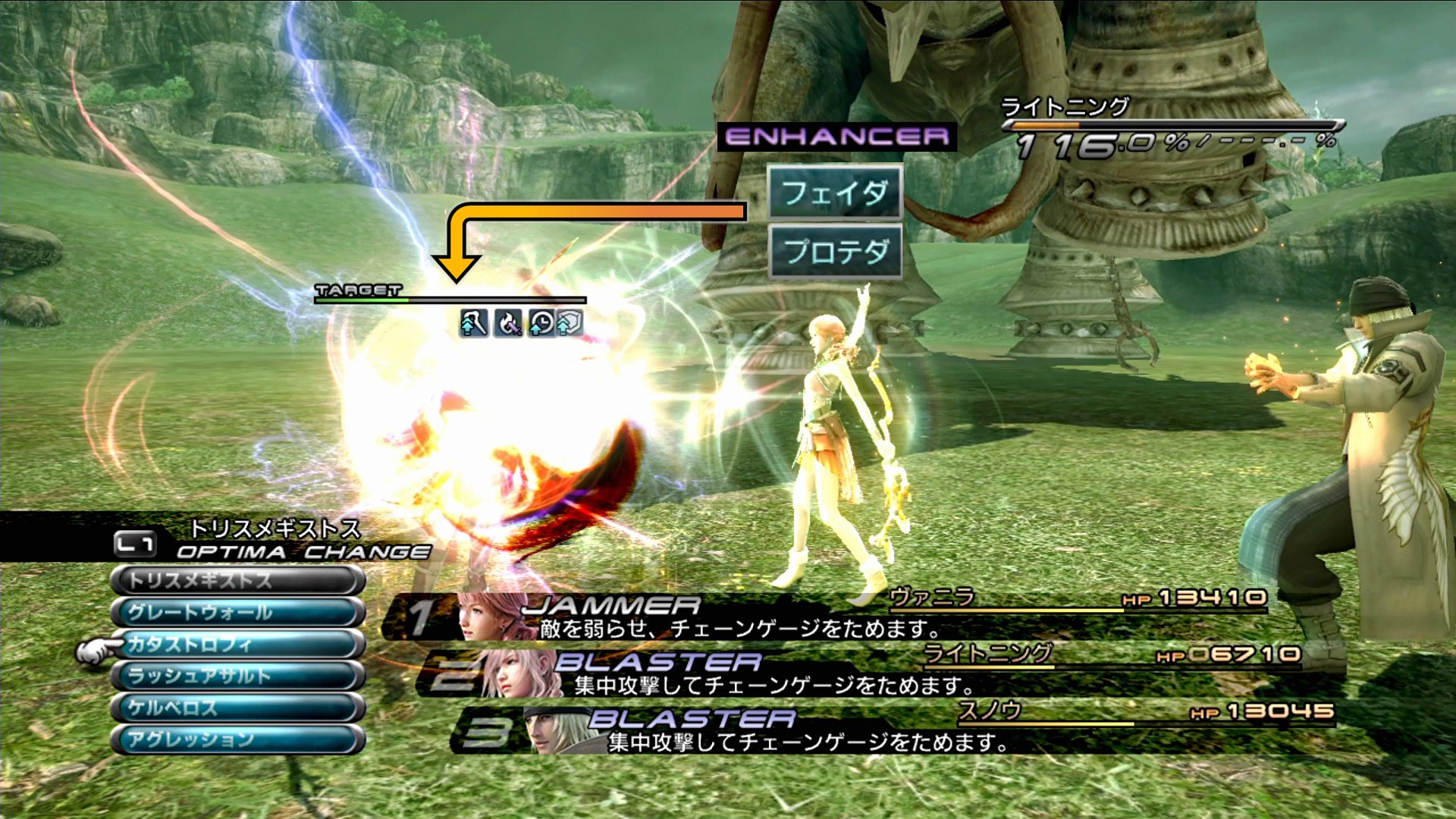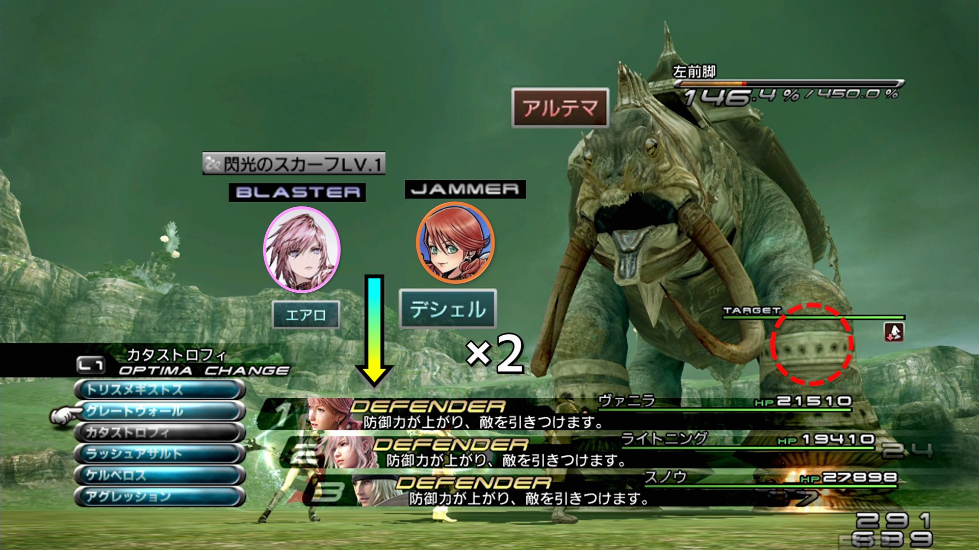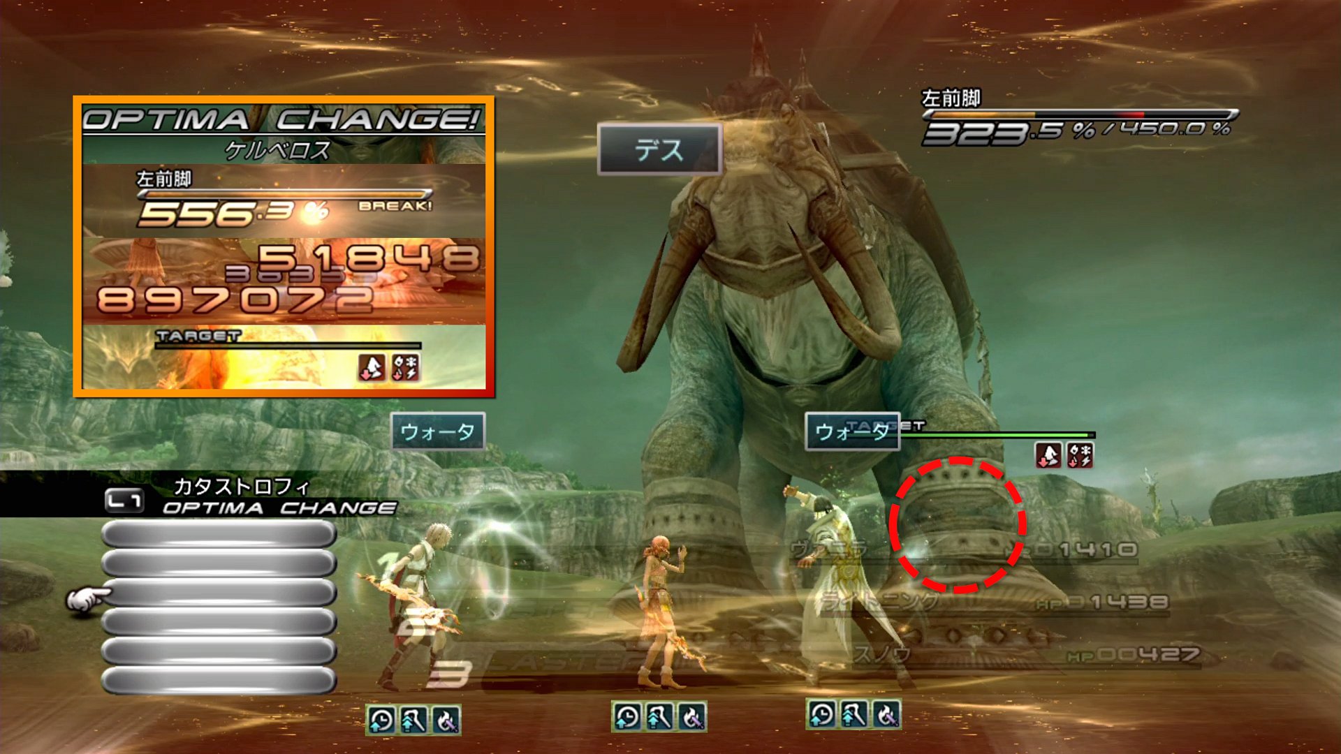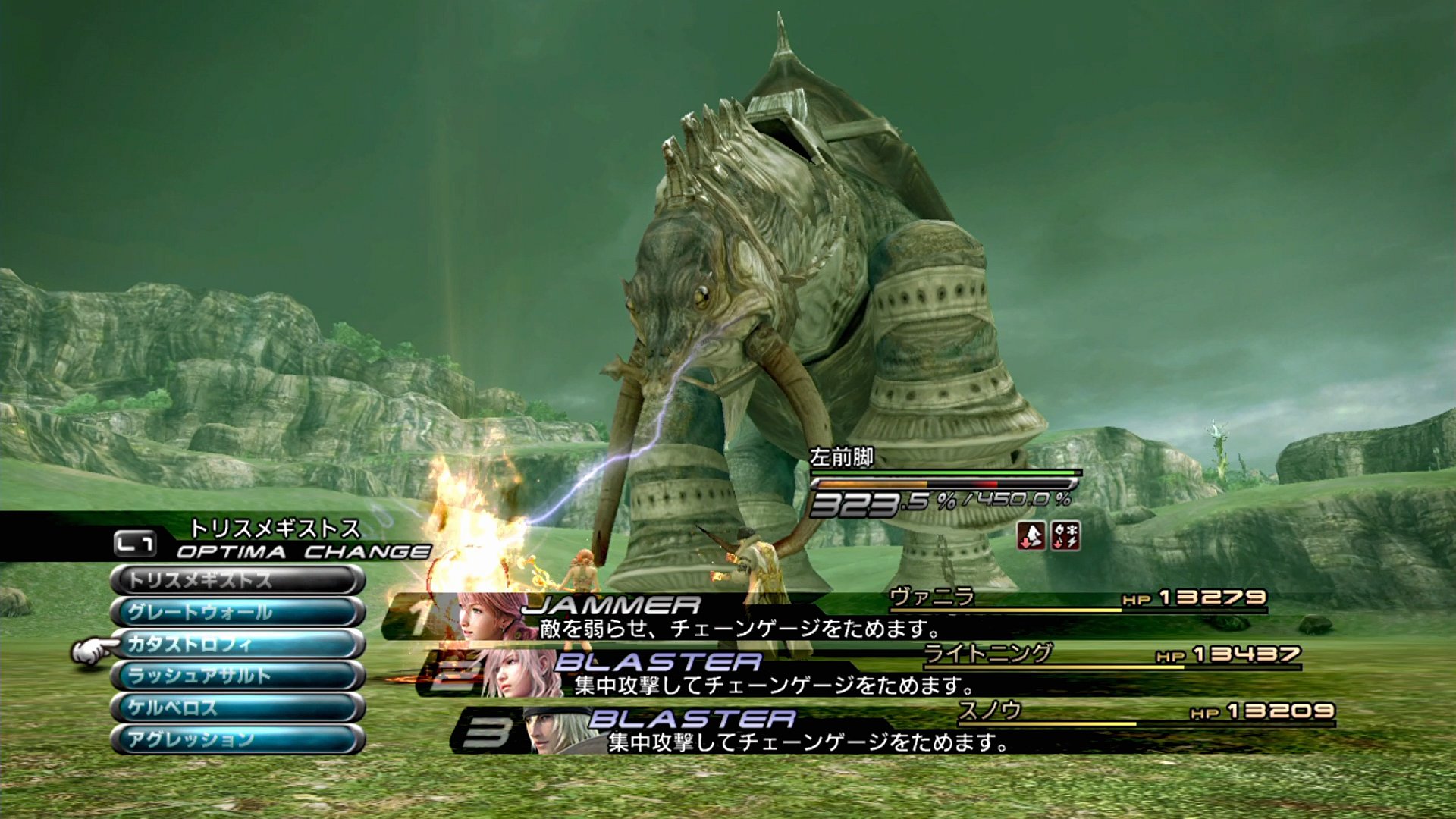 では、この、1本目の脚を狩り取るパートでの行動である。ENHでの強化後、12秒ルールを適用可能な「JAM+BLA+BLA」に変え、リーダーのヴァニラは「デス」を確定させ、ライトニングとスノウが6発目のBLA魔法を宣言したら、「ATK+ATK+ATK」に変更していく。以上である。