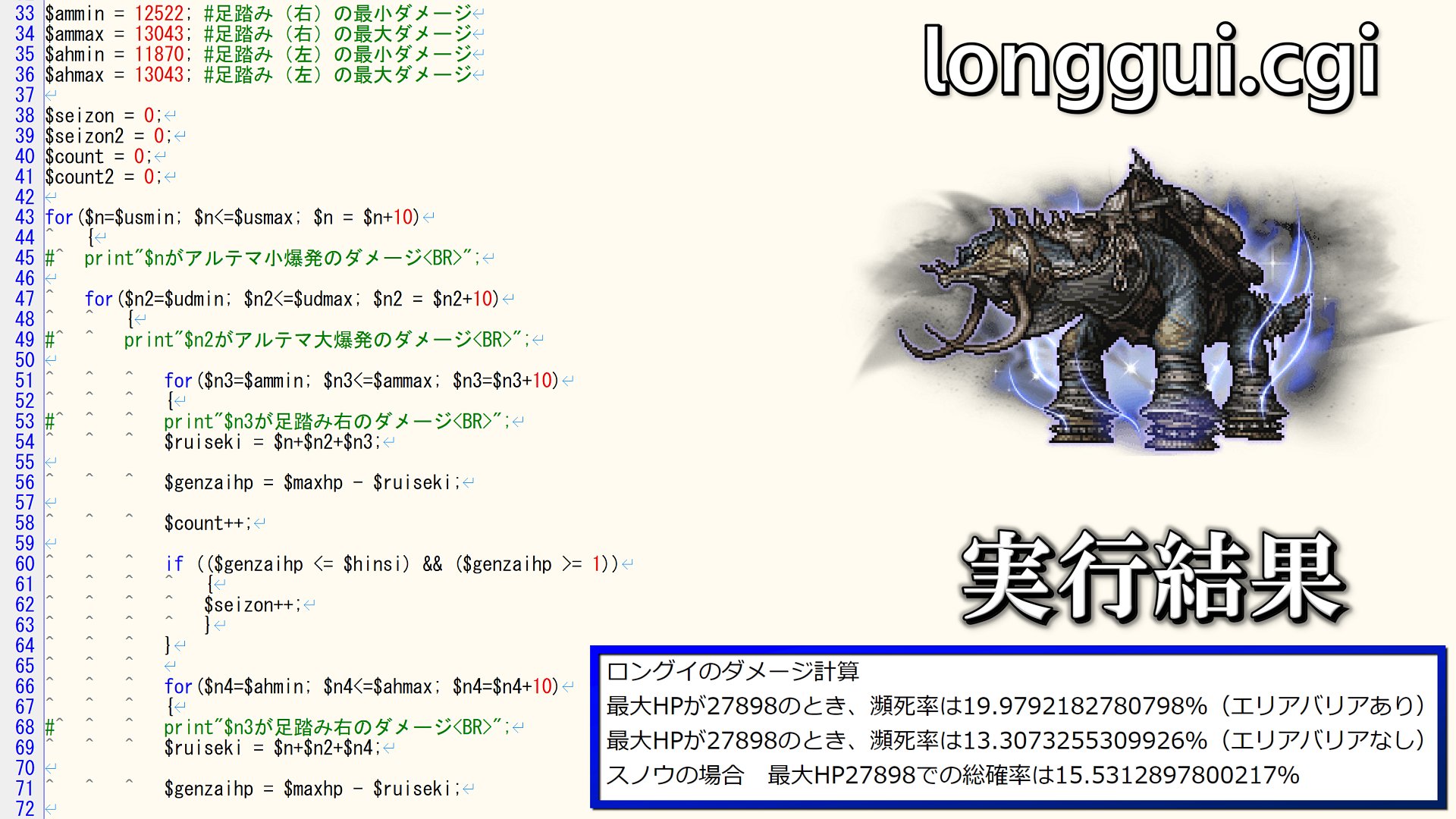 やれ。実際には、この確率は、様々な手法によって、かなり軽減することができた。しかしながら、結局のところ、「アルテマ」のダメージにより、3人が狙ったHPになってくれなければ、絶対に勝てないことは確かであるため、根本的な運要素からは逃れることができなかった。