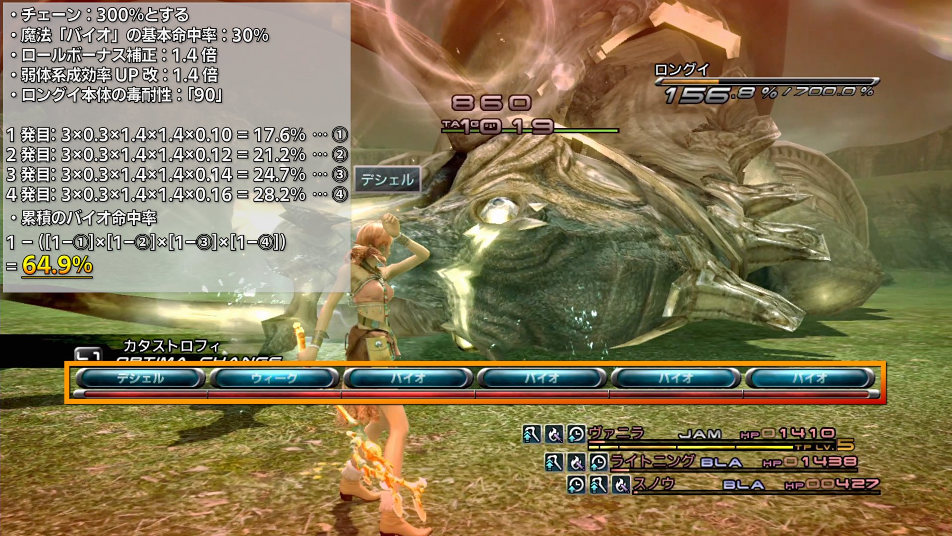 …というのも、きつねうどん氏のファングリーダー作戦(【こちらの動画】など)では、このタイミングでライトニングにJAMを担当させ、敵に「バイオ」を掛けている。ロングイ本体は、完全に倒れ込んで止まるまで、チェーン耐性は「100」から低下せず、各種のステータス異常が有効となることも無い。しかし、「バイオ」は、ステータス判定が少し遅れて発生するタイプであるため、転倒前に使っても、ステータスが入るようになってから判定が適用されてくれることもある。そして、事前に脚に対してデシェル・ウィーク・デプロテを発動させておく(ライトニングの使用魔法では「バイオ」のみが残っている状態にする)ことと、オプティマチェンジのタイミングにより、「倒れ込み中のロングイ本体に、ライトニングがバイオを使ってくれる」という状況を実現可能なようだ。