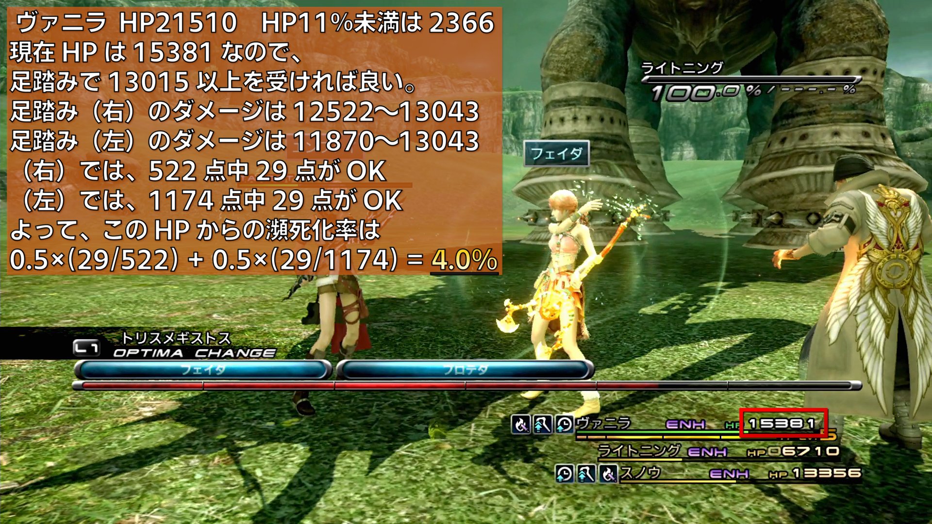 ――何故なら、足踏みのダメージは約13000であるため、従来は、アルテマを受けたのちのHPが「3人とも」「14000程度」とならなければ、その後に全員がHP11%未満瀕死になることはできなかった。ところが、1人にプロテダを掛けられる前提であれば、その1名はHPが7000程度でも良くなる。よって、成功パターンは、「@全員が14000程度(この場合はプロテダを掛けてはいけない)」「Aヴァニラが7000、他2名が14000」「Bライトニングが7000、他2名が14000」「Cスノウが7000、他2名が14000」の4通りとなる。もし、プロテダを使わない場合、成功となりうるのは、最初の@だけであった。正確な計測はしていないが、アルテマのダメージが均等に分布するとした場合、@ABCは出現確率が同程度となるはずだ。