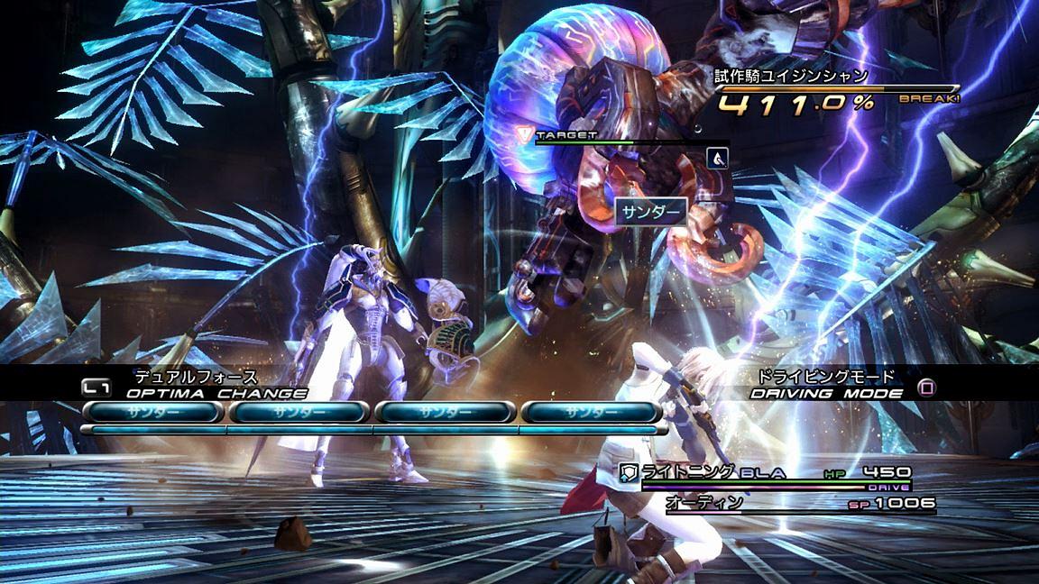 タイミングを見てドライビングに移行してギリギリまで攻撃」という過程を辿るようにしたい。というわけで、チェーンボーナスが160%を超えた辺りからはひたすら「ATK+HLR」で粘っていき、170%に達した辺りで敵が「対水流モード」を宣言したため、オーディンを召喚する。その後は、「BLA+BLA」を中心にチェーンボーナスを伸ばしていき、過去作やり込みと同じく「チェーンゲージの『%』表記の右端」までブレイク時間が減ったらドライビングに移行し、「真空波」と「雷光斬」を適切に用いてダメージを与えていく。そうして、最後の「斬鉄剣Lv.3」でチェーンボーナスを906.9%にまで増やし、無事に一撃死させることに成功した。タイムは9分28秒である。しかしながら、最後のHP的にはかなりギリギリであり、「敵がいつ『対水流モード』を宣言するか」という運によるところも大きいため、戦略としての採用には一考を要するだろう。
