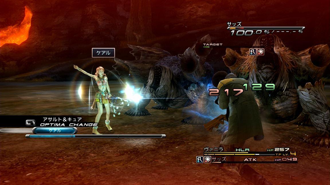 …さて、5章のガプラ樹林からは、FF13序盤の特徴である「2人パーティ」が本格的にスタートする。そこでは、主に「ライトニング+ホープ」と「サッズ+ヴァニラ」の2通りのメンバーでバトルを進めていくことになるのだ。そのような構成になっている理由は、もちろん物語上の都合なのであるが、これがFF13のバトルシステムのチュートリアルであることは言うまでもない。ゲーム性が狭まるのは承知のうえで「2人パーティ」という形式を取り、各ロールの使い勝手を順番に学ばせる形にしていったのだ。まあこれは、良いとか悪いとかの話ではなく、発売から6年が経ったFF13の“特徴”として、素直に受け入れるべきものなのであろう。まあ、スノウ+ホープでのDEF講習というイカれた構成が登場していたりもするがな!!!