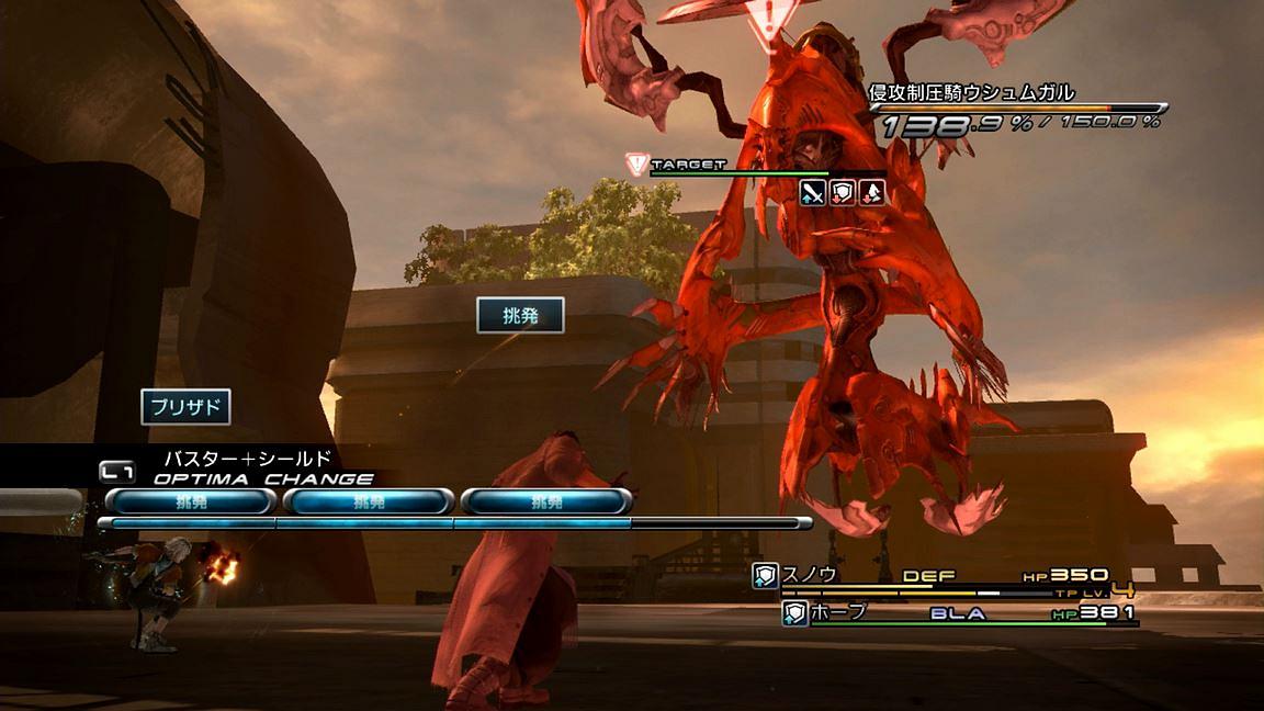 そんなこんなでスノウ+ホープ編を終わらせ、ファング+ライトニングのパートでは適当に雑魚を倒しながら進んでいき、ボスの「侵攻制圧騎ウシュムガル(2回目)」戦。この敵は強力な攻撃を多数使用してくるが、ファングJAMによる「スロウ」、ホープENHの「プロテス」、そしてファングDEFを使った「リジェネガード」による防御を用いていけば、クリスタリウム封印の条件下でも普通に耐えることができる。「ロックオン」後の集中攻撃は、アイテム使用禁止だと戦闘不能キャラが蘇生できないため鬼畜…と言いたいところであるが、ロックオン成立後にファングが「挑発」を入れることで普通にターゲットを変更できるため、何ら問題は無い。そんな感じで、少し時間は掛かったが、特に危なげなく撃破をすることに成功した。