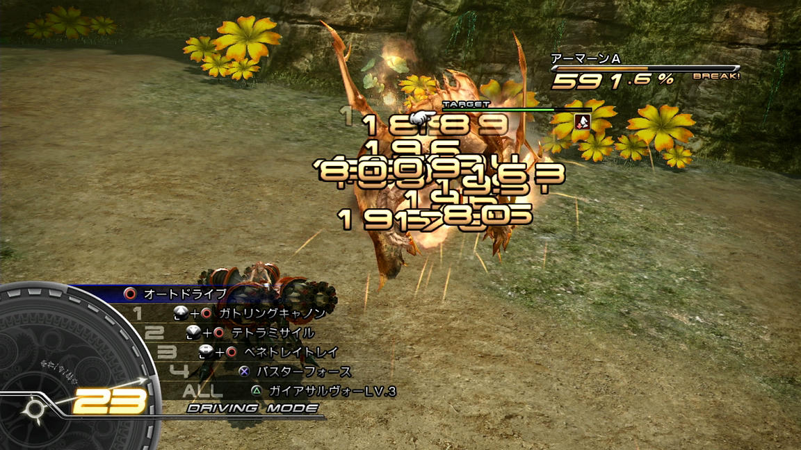 …つまり、ヴァニラのJAMでアーマーンBを狙うだけしてから「召喚」を実行すれば、直後のヘカトンケイルの攻撃はアーマーンAに向かってくれやすいのである。その後は、すぐにターゲットをAに切り替え、「デシェル」を撃ち込んでいけば良い。実際に何度かやってみたが、確かにJAMの場合はヘカトンケイルはヴァニラと違う敵を狙ってくれることが多いように感じた。これで、ダメージもチェーンボーナスも稼ぎやすくなる。そうしてドライブゲージを満タンにしたら、あとは「バスターフォース」→「ガトリングガン*3+1」→「バスターフォース*6」からの「ガイアサルヴォーLv.3」でOKだ。全ての準備が整っていれば、高確率でアーマーンAを仕留めることができるだろう。こんな特性が有ったとは…。
