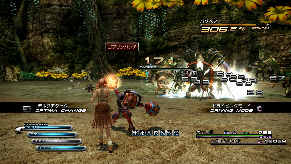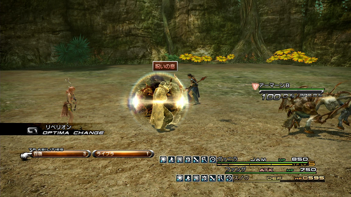 ――そうしたら。最後に、FF13-2の「ヴァルファズルLv.45」戦(【プレイ日誌・第26話】)で用いたのと同じ、「次のオプティマチェンジで12秒ルールを適用できる状態」を作れるようなタイミングで「BLA+ATK+BLA」に変え、ファングが「ルイン」を宣言したら「召喚」を入力する。こうすると、HP75%のトリガーが引かれたことによりオチューは「タネまき」を使うのだが、直後のオーディンの「サンダラ」によってブレイクキャンセルが行われるため、そのまま攻撃を続行することができるのだ。