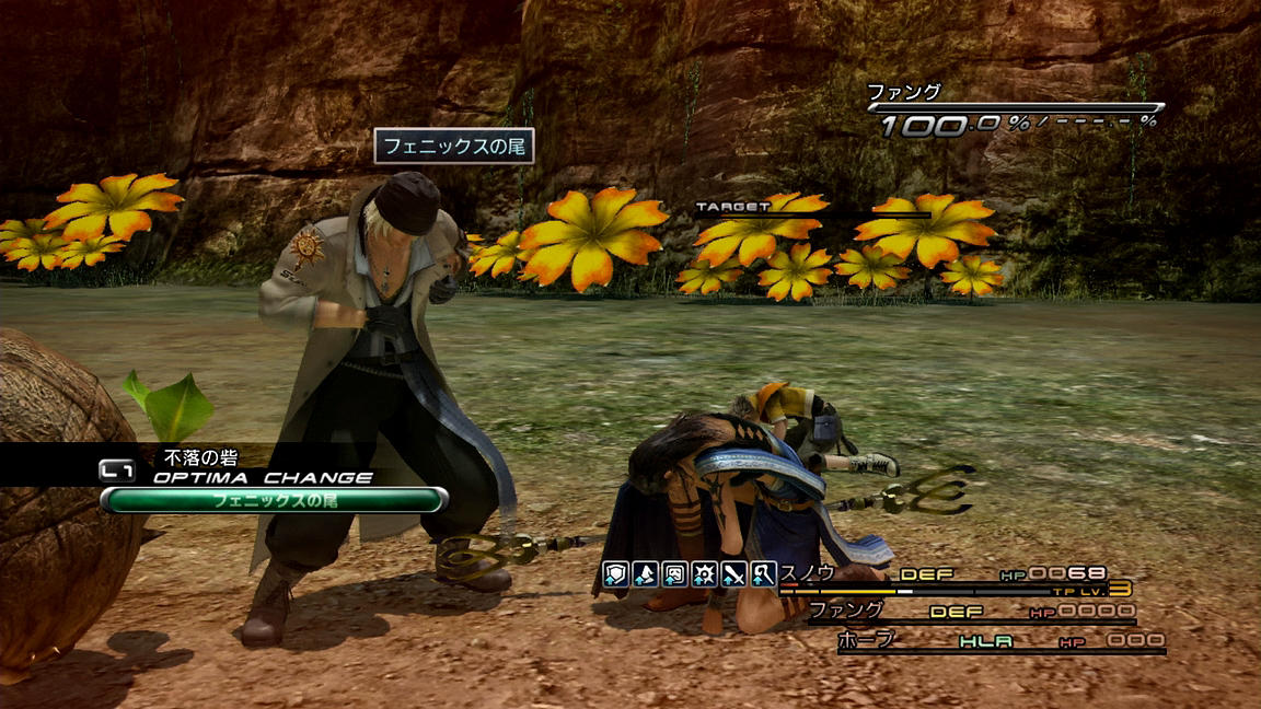のだが。今回、敵がオチューだけではないことが極めて大きなネックになってくる。「がなる」を受けると、ホープはもちろんとしてファングもHP全快でも無い限り戦闘不能状態になってしまうのだが、今回バトルでは初期から2体登場するコチューがすぐさま攻撃を仕掛けてきてしまう。しかも、「がなる」によってブレイブ状態になっているというおまけ付きである。よって、HPギリギリで「がなる」に耐えるだけでは、すぐに全滅してしまうのだ。