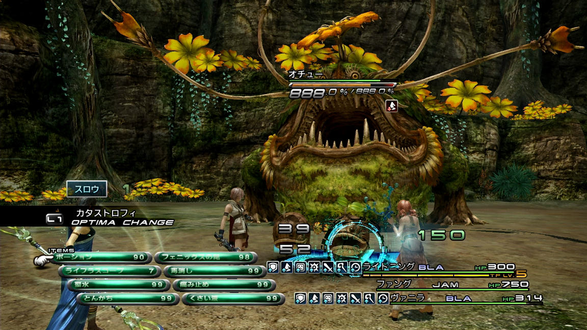 …まず、開幕はライトニング・ファング・ヴァニラでの「ATK+DEF+JAM」でスタートし、オチュー本体に「デシェル」を掛けながらラッキーブレイカーの発動を狙っていく。この際、ファングの「挑発」が特にオチュー本体には効きづらいが、根気良く待つしか無い。ライトニングは、適度にATKで攻撃しながらも、HLRや「ポーション」で戦闘不能者が出ないように回復していく。なお、ファングは「ソーサラーサインLv.1」を装備しておりHPは750であるが、HP全快かつガード状態ならばオチューの触手攻撃に耐えることができるため、可能ならば狙っていくと良いだろう。