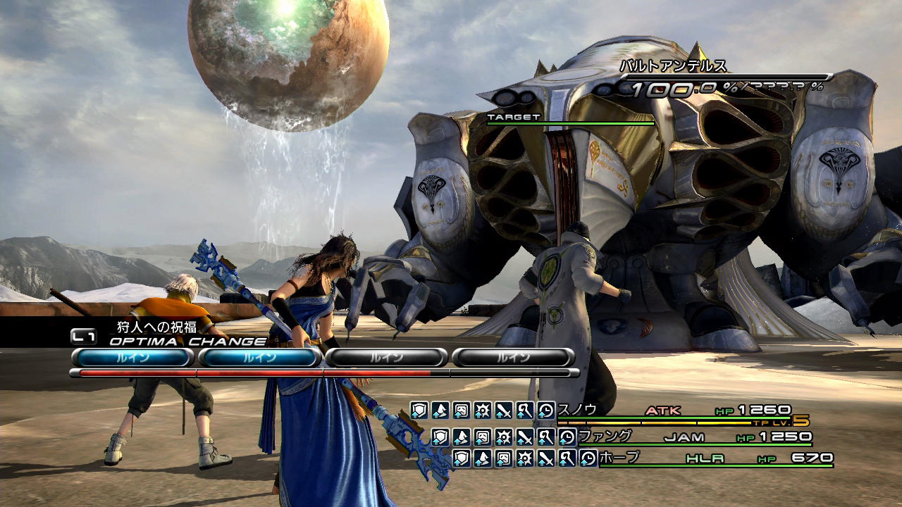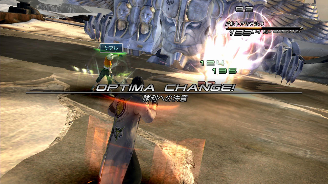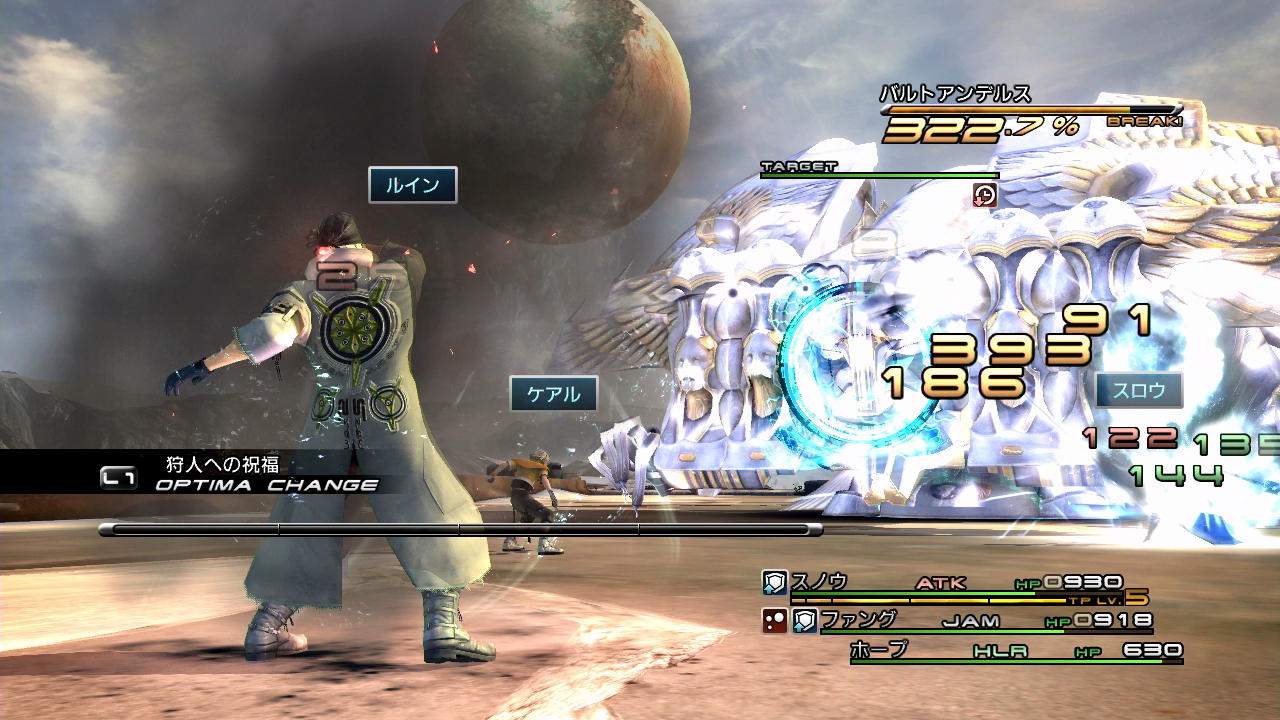 …というのも、FF13-2のクリスタリウム封印プレイにおけるヴァルファズルLv.45戦(【該当プレイ日誌】)で、仲間モンスターのBLAライトニングが連続攻撃をするパターンで用いたように、FF13のキャラクターは、オプティマ変更をするタイミング次第で、その変更モーションを省略して連続攻撃をしてくれる場合がある。そして、ホープの「ケアル」の場合は、画面に「ケアル」の文字が表示されたら変更をし、12秒ルールが適用されたうえで誰かのHPが減っている状況が続いていれば、ほぼ確実にノータイムで「ケアル」の使用を続行してくれるのだ。