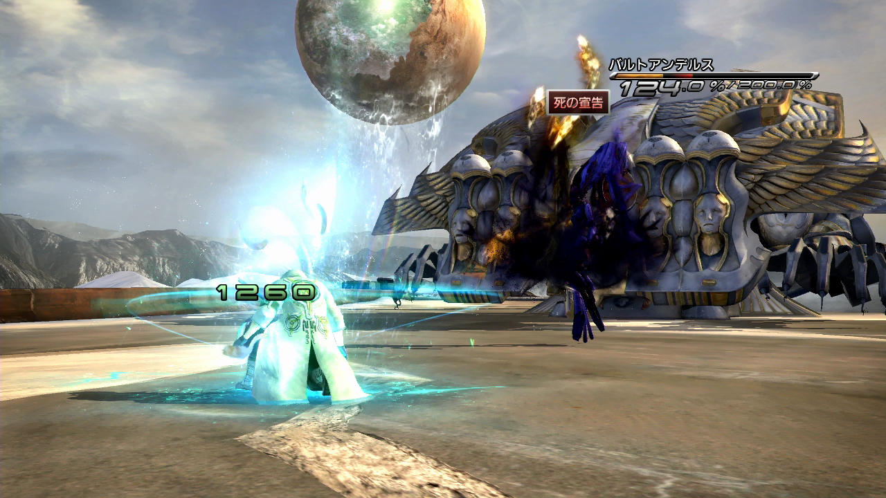 …やれ、皆さまご存じの通り、PS3ディスク版のFF13には、2011年7月からオンラインでアップデートパッチが配信されており、それを適用してゲームバージョンを「1.01」にすることにより、「イージーモード」などが使用可能になった状態でプレイをすることができる。内容面で大きな変更は無いのだが、僅かながらバトル面で変更されている要素が存在し、とりわけ本バトルにおいては、16回連続攻撃である「タナトスの哄笑」が、一番後ろに下がっていても命中するという大きな違いが存在する(1.00では、画面の一番後ろにまで下がっていると命中しない)。なお、ゲームバージョンは、アップデートパッチの削除/再ダウンロードを繰り返すことにより、何度でも制限無く変更することができる。詳しくは【こちら】をどうぞ。