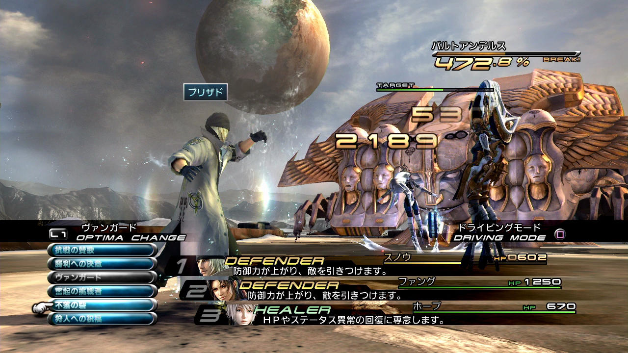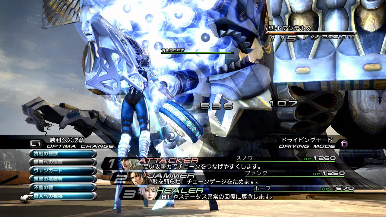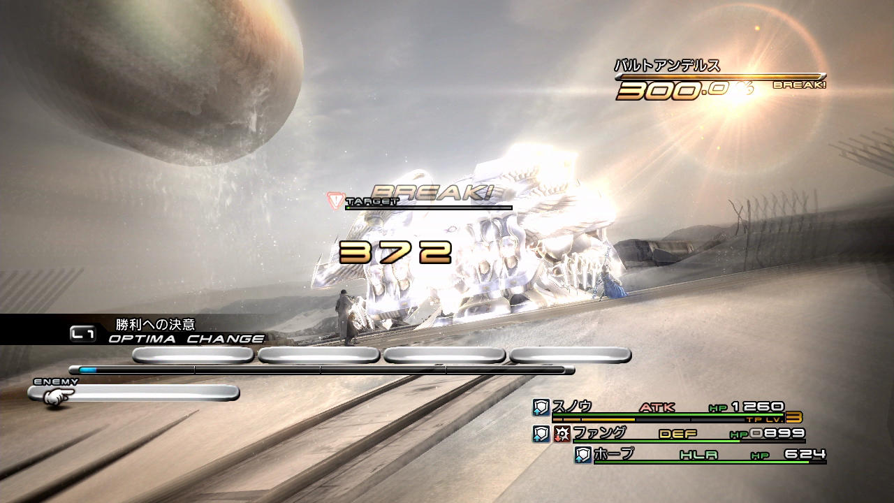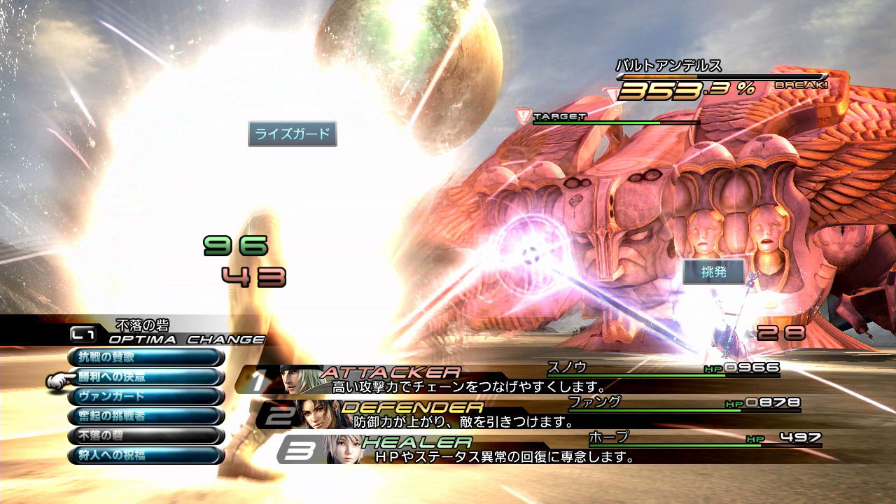 …というのも、まず前提として、初代FF13の「挑発」は確率制であり、『13-2』のように決まったタイミングで必ず成功させることはできない。そして、バルトアンデルスへの「挑発」(基本命中率45%)の成功率は、計算上「31.5×チェーンボーナス[%]」となるはずだが、実際にはこんな確率で決まるわけもない。体感だが、チェーンボーナスを350%まで上げたうえで、概ね7〜8回くらいは「挑発」を放たないと成功させられない感じだった。