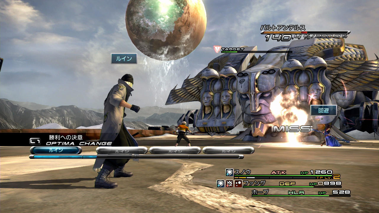 ――逆に、絶対にやってはならないのが、「タナトスの哄笑」に合わせてアイテムで回復する手段である。FF13-2のオメガ戦で使ったように、アイテムの使用中はノックバックや引き寄せが無効化されるため、焦って「ポーション」などを使ってしまうと、スノウが後ろに押し出されず、むしろ大きなダメージを受けてしまう危険性が高いからだ。もし、危ないタイミングで「タナトスの哄笑」を宣言されてしまった場合も、「DEF+DEF+HLR」に変えるだけにして乗り切っていきたい。また、位置関係がしっかり完成している際は、無闇やたらにオプティマチェンジをすると、「リジェネガード」が切れてファングが後ろに押し出されてしまう可能性が増えるため、できればそのままドンと構えて受け止めたい。最終的に、何事も無かったかのように、攻撃をしながら「タナトスの哄笑」を乗り切ることができれば最高である。