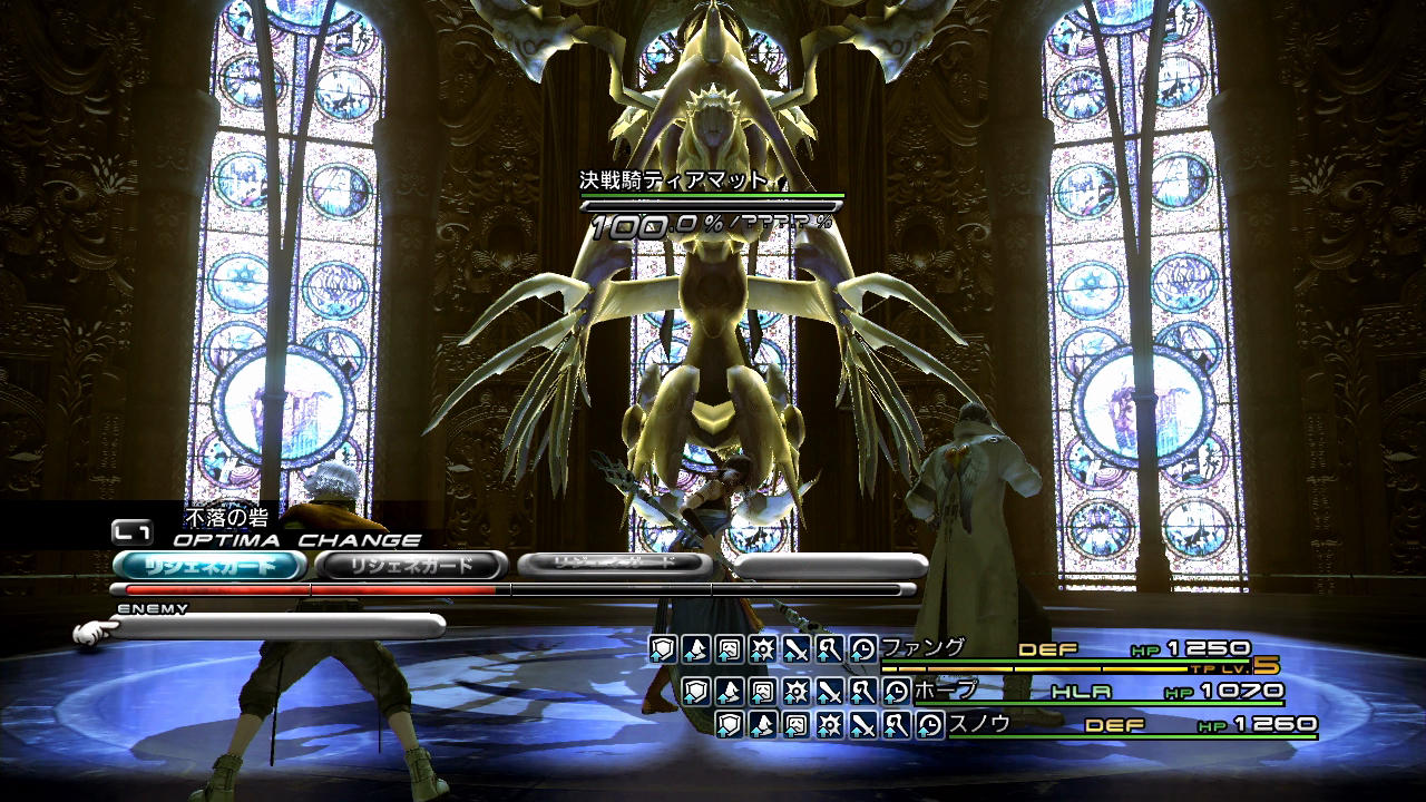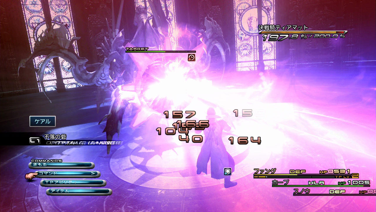 ――具体的な戦い方は、まず地上モードから移行後、すぐに「DEF+ENH+DEF」を使い、最低でもファングとスノウには「プロテス」を掛ける(ホープは後でも良い)。その後は、2つの「JAM+HLR+DEF」と「JAM+BLA+DEF」「JAM+BLA+BLA」を使い分けて、素早くチェーンボーナスを伸ばしていく。スノウをDEFから外すか否かの判断は、「ファングとホープのHPが高く保たれているか(DEFのスノウのみのHPが大きく減っている場合は、DEFを外し、攻撃を分散させつつ『ポーション』で回復させると良い)」「ファングがしっかり後ろに下がりきれているか」「スノウが後ろに押し出されていないか(押し出されていたら挑発を解除して前に進ませる)」あたりを基準とすれば良いだろう。そうして、ブレイクができたら、あとは「JAM+HLR+DEF」を繰り返し使用し、状況立て直しとTP回復を行いながら、次の地上モードへの準備を行っていけば良い。