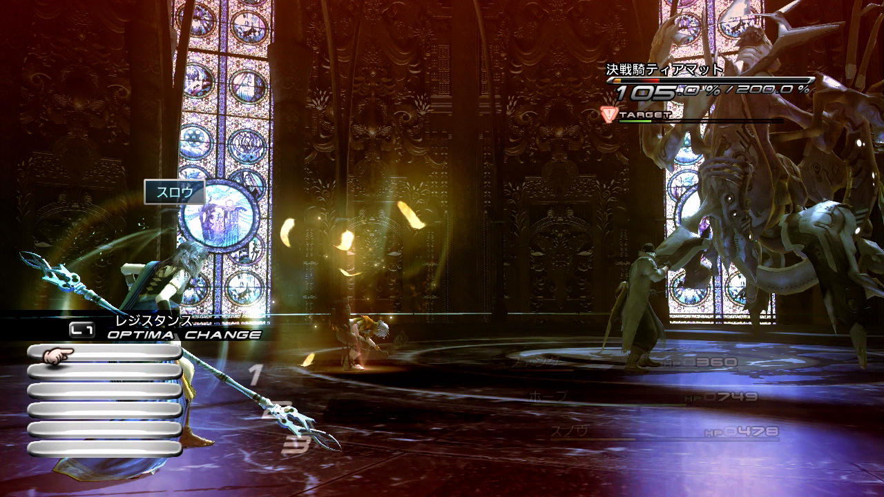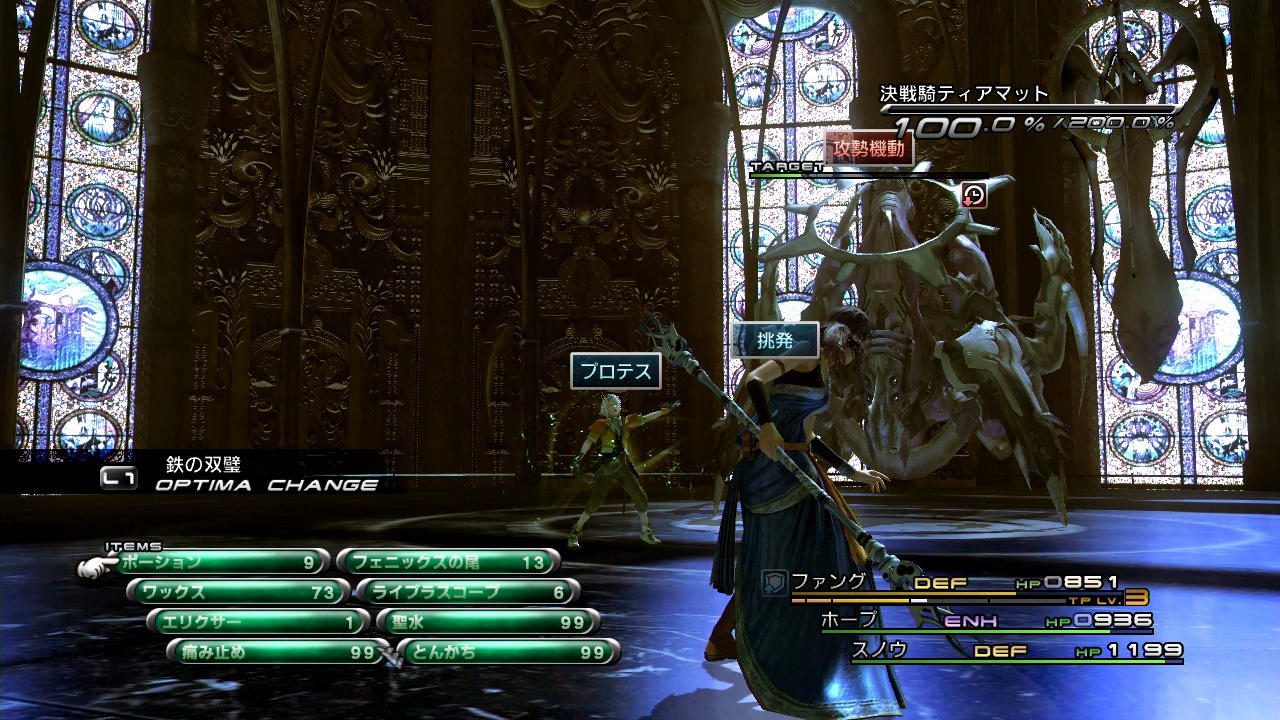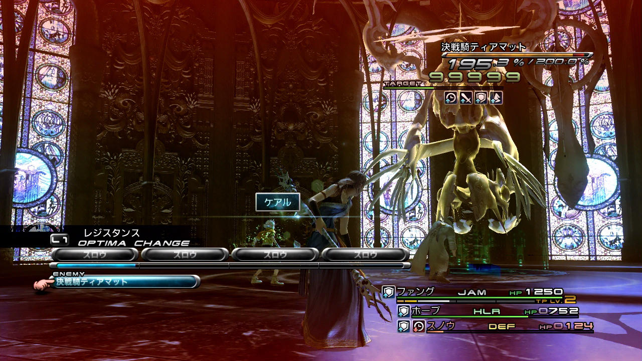 …というのも、例えばあのバルトアンデルス(2回目)戦では、オプティマチェンジをタイミング良く用いて、「ケアル×2」→「ケアル×4」を連続で用いることにより、回復効率を上げるテクニックを多用していった。ところが、今回バトルでは、HLRのホープが頻繁にひるまされるため、ゲージを溜めて「ケアル×2」ではなく、「ケアル×3」を使ってしまう場合がある。そしてこの際、「ケアル×2」と思ってオプティマ変更をすると、3連続で「ケアル」を使うつもりだったホープが、12秒ルールで補充したゲージを“前借り”してしまうかのような現象が起こる。結果として、ホープは「ケアル×3」→「ケアル×3」と行動することになり、スロット1個ぶん損していることはもちろん、行動効率も上がらず、しかもTPも回復できないという極めて悲惨な事態になってしまうのだ。これ自体は、単なる小さなミスに過ぎないのだが、このバトルはかなりの長期戦となるため、こういう細かな点の積み重ねも見逃せない。というわけで、今回は「ケアル」をしっかり放ちきることを確認してから、オプティマチェンジを行ったほうが良いだろう。
