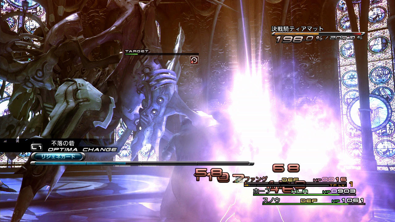 そして、大技の「フォトンブラスター」に関して、詳しく触れてみよう。これについては、上記の通り、素早くブレイクをしてそもそも使わせないことが一番である。敵は、懐かしのファルシ=ダハーカのように、「しばらく攻撃をすると、『フォトンブラスター』の準備に入り、ATBゲージを溜め始める」というパターンを取り、これについては「チェーンボーナスの値(普通は160〜170%程度)」と「敵が急に攻撃をしなくなること」により容易に推測することができる。ただし、ダハーカ戦と異なり、この最中にも敵は通常の「ビームレイン」などを使ってくることがあるため、すぐさま防御を捨てて全力攻撃というわけにはいかない。そのため、HLRでHPを回復し、途中で「DEF+ENH+DEF」に一瞬だけ変えてファングに「プロテス」を貼って、間に合わず「フォトンブラスター」を使われてしまった場合にも備えてから、「JAM+BLA+BLA」などで一斉攻撃を仕掛けていこう。