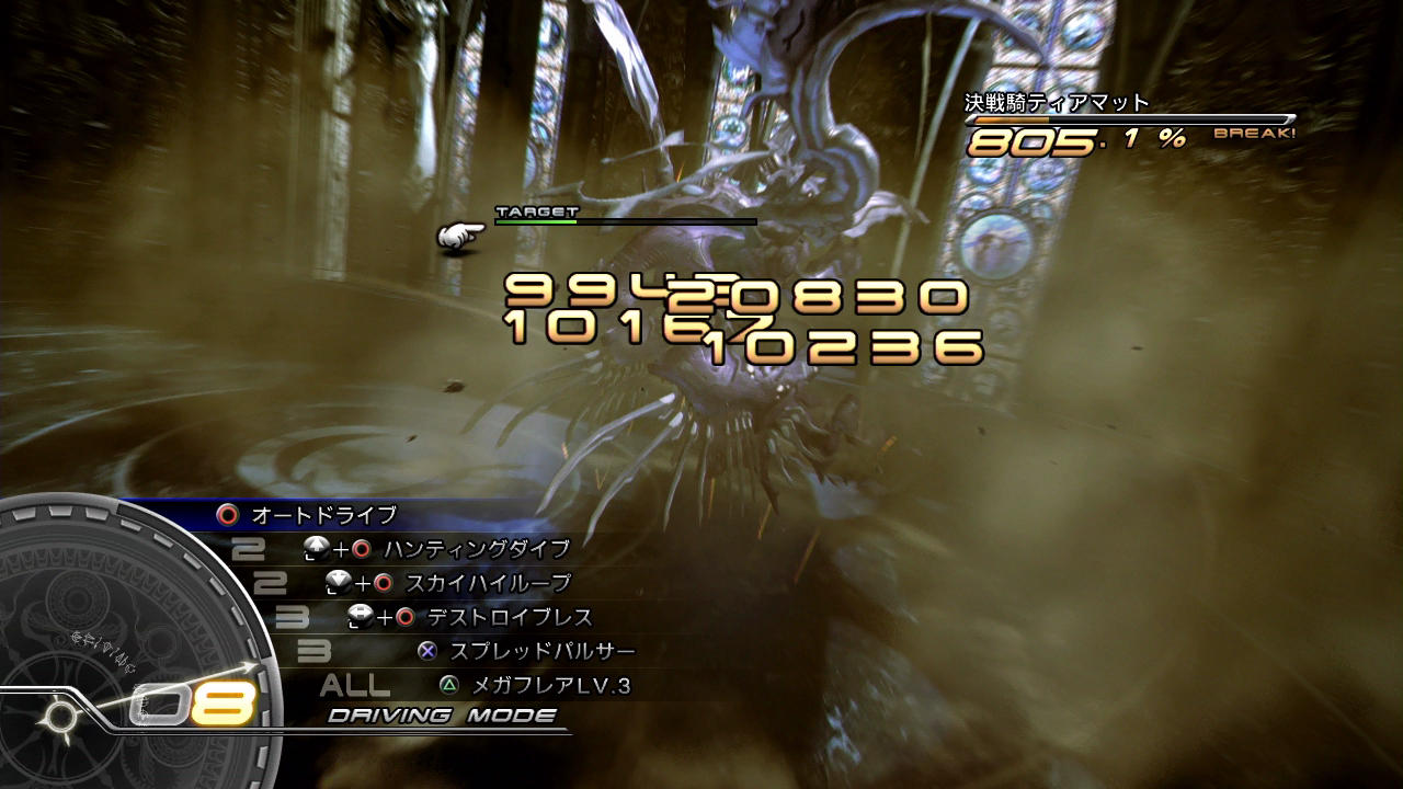 …そして、ドライビングモードでの行動パターンについては、まず「スカイハイループ→デストロイブレス×2」を2回繰り返し、次に「スカイハイループ×2→ハンティングダイブ」を2回、最後に「スカイハイループ→メガフレアLv.3」を入力する。「デストロイブレス」主体のいつもの行動と若干異なるが、実はバハムートの行動で最もダメージ効率が良い攻撃は、デストロイブレスの5hit(ドライブ値3でダメージ倍率2.65、つまりドライブ値1に対するダメージ倍率は0.88)を繰り返すことではなく、「スカイハイループ」(ドライブ値2で倍率2.12、つまり1に対して1.06)と「ハンティングダイブ」(攻略本と異なり、攻撃は最大で4hitするので、その場合はドライブ値2で2.65、1に対し1.33)を上手に当て続けることである。ただし、後者2つの突進系の技はチェーンボーナスの上昇量が少ないという特性があるため、それらを上手く組み合わせた結果、前述のような行動に至った。要は、このパターンが一番ダメージが与えられたということである。