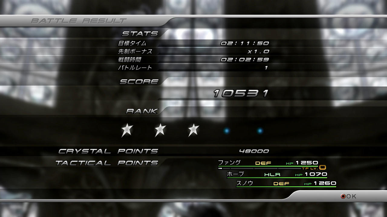 ――まあ、このようなバグは、もし再現性があるのなら積極的に戦法として取り入れていくべきだと思うが、そうでない限り、狙っていくのは避けるべきかもしれない。実際に私は、このバグが勝利時に起こらなかったことは、少なくとも現状では良かったと思っている。とはいえ、FF13のバトルは、もはやバグでも使わないと苦しいというレベルにまで達しつつあるのも事実であるため、このことがまた何かに繋がれば良いなあ…。
