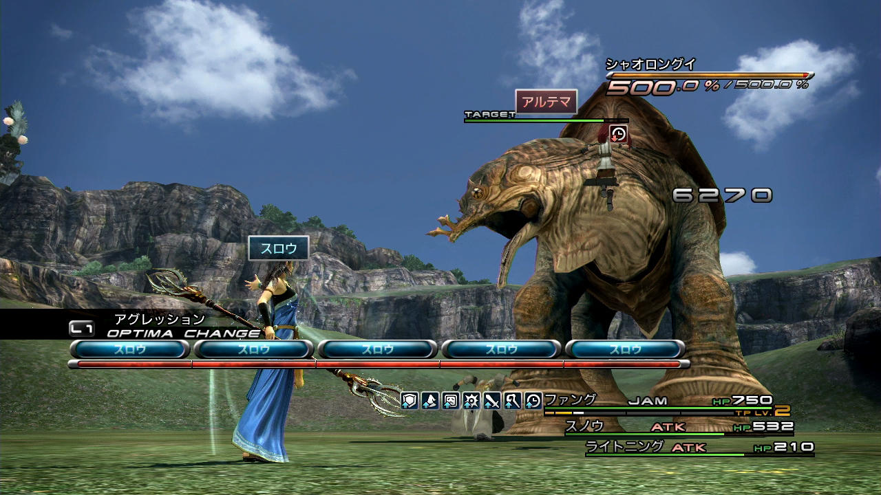 …まず、今回重要となるのが、敵の行動ペースの間にこちらが行える攻撃回数である。「ゆっくり」&「スロウ」を用いた場合、敵の足踏み間隔は約1分となるが、この時間はFF13のバトルの特性上、かなり前後することになる。実際のバトルでは、確実に行えるのは、12秒ルールを用いつつ行動3セット分というところであった。一応、この回数はかなりの余裕を見たものであり、4セット分の攻撃を加えることも、足踏み(右)を避けた後ならほぼ確実に、足踏み(左)を避けた後でも大半の場合は行うことができる。ただし、後述するが、今回は特定タイミングでHP540万を切ることが重要となり、行動3セットで止めておくとちょうど良くHP50%のラインを超えられることが多いため、チェーン上昇が間に合わない場合を除き、ほとんど早回しは用いなかった。