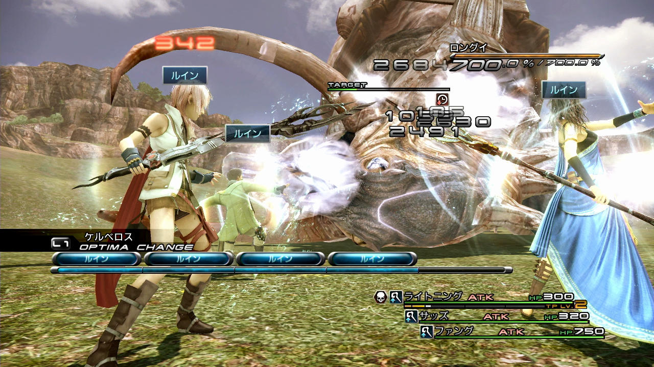 …さて。今回、足踏み間で安定して攻撃を仕掛けられるのは計7セット・起き上がった直後のみ6セットである。ということで、まずは戦闘不能となった2名をライトニングが蘇生させてからオプティマチェンジ、「BLA+ENH+ATK」でフェイスを掛け、あとは「BLA+BLA+ATK」でロングイ本体に攻撃を仕掛けていく。敵は、既に転倒中にチェーンボーナスが700.0%になっており、できれば「ATK+ATK+ATK」で攻撃を仕掛けたいのであるが、今回は両足が存在するため、2名以上のATKでは攻撃が散ってしまうのである。また、敵の攻撃が早まると普通に足踏みで死ぬため、モーションの遅いサッズの行動は犠牲にし、ファングの攻撃でセット数を数えていきたい。そんな感じで7セット(初回は6セット)攻撃したら、「ATK+BLA+JAM」に変えて、タイミング良く「たたかう×1」を入力して、足踏みを回避する。以降、この繰り返しである。だいたい、1回の足踏みの間に、10万強のダメージを与えることができる。